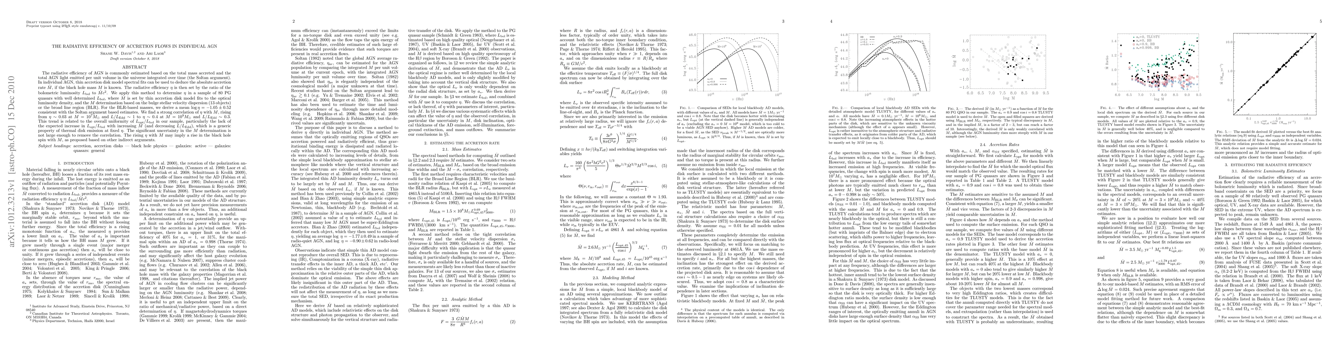 The radiative efficiency of AGN is commonly estimated based on the total mass accreted and the total AGN light emitted per unit volume in the universe integrated over time (the Soltan argument). In individual AGN, thin accretion disk model spectral fits can be used to deduce the absolute accretion rate Mdot, if the black hole mass M is known. The radiative efficiency {\eta} is then set by the ratio of the bolometric luminosity L_bol to Mdot c^2. We apply this method to determine {\eta} in a sample of 80 PG quasars with well determined L_bol, where Mdot is set by thin accretion disk model fits to the optical luminosity density, and the M determination based on the bulge stellar velocity dispersion (13 objects) or the broad line region (BLR). For the BLR-based masses, we derive a mean log {\eta} = -1.05 +/- 0.52 consistent with the Soltan argument based estimates. We find a strong correlation of {\eta} with M, rising from {\eta} ~ 0.03 at M = 10^7 M{\odot} and L/L_Edd ~ 1 to {\eta} ~ 0.4 at M = 10^9 M{\odot} and L/L_Edd ~ 0.3. This trend is related to the overall uniformity of L_opt/L_bol in our sample, particularly the lack of the expected increase in L_opt/L_bol with increasing M (and decreasing L/L_Edd), which is a generic property of thermal disk emission at fixed {\eta}. The significant uncertainty in the M determination is not large enough to remove the correlation. The rising {\eta} with M may imply a rise in the black hole spin with M, as proposed based on other indirect arguments.