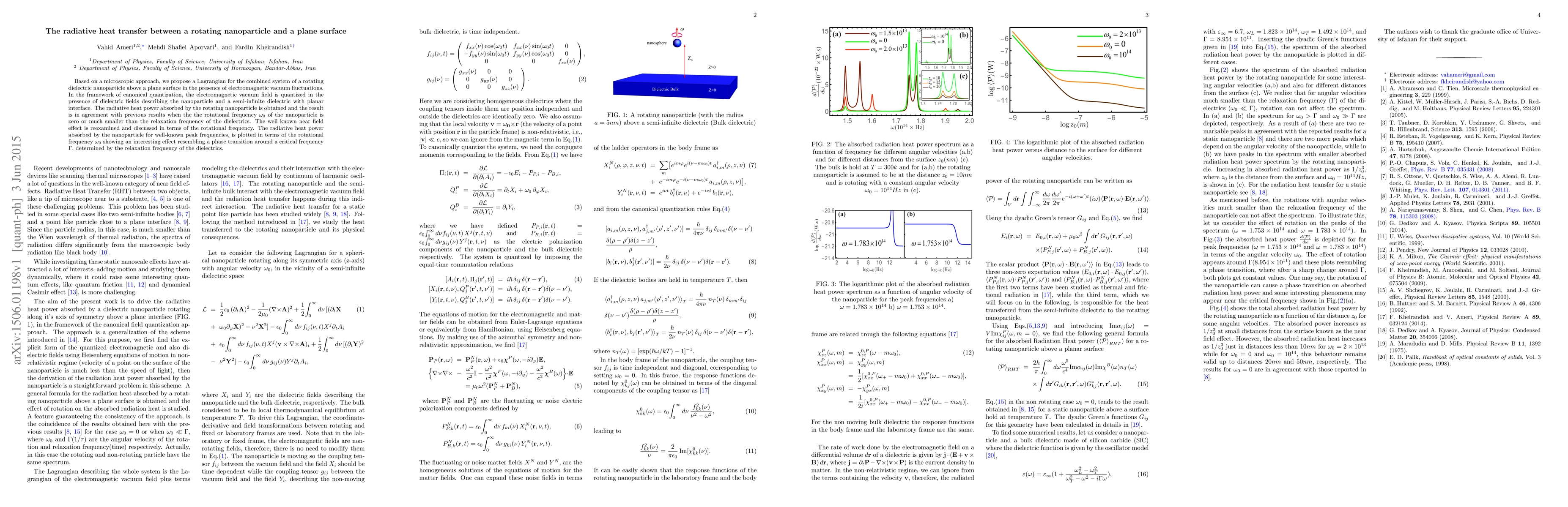This research proposes a Lagrangian model for a rotating nanoparticle above a plane surface, considering electromagnetic vacuum fluctuations. It quantizes the electromagnetic field in the presence of dielectric fields and finds that the nanoparticle's radiative heat power absorption varies with rotational frequency, showing a phase transition-like effect near a critical frequency determined by the dielectrics' relaxation frequency.