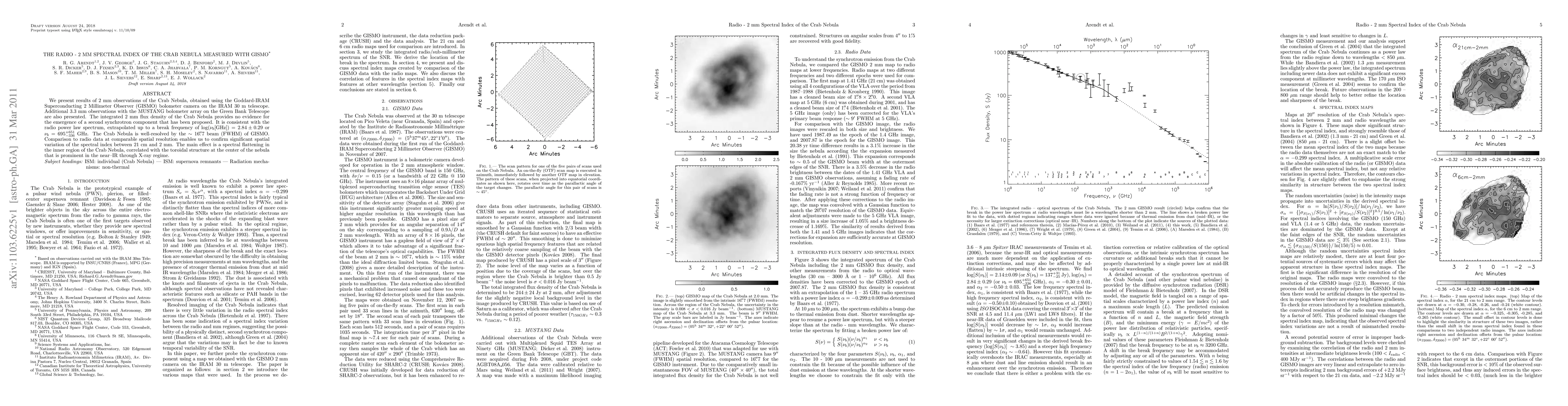 We present results of 2 mm observations of the Crab Nebula, obtained using the Goddard-IRAM Superconducting 2 Millimeter Observer (GISMO) bolometer camera on the IRAM 30 m telescope. Additional 3.3 mm observations with the MUSTANG bolometer array on the Green Bank Telescope are also presented. The integrated 2 mm flux density of the Crab Nebula provides no evidence for the emergence of a second synchrotron component that has been proposed. It is consistent with the radio power law spectrum, extrapolated up to a break frequency of log(nu_{b} [GHz]) = 2.84 +/- 0.29 or nu_{b} = 695^{+651}_{-336} GHz. The Crab Nebula is well-resolved by the ~16.7" beam (FWHM) of GISMO. Comparison to radio data at comparable spatial resolution enables us to confirm significant spatial variation of the spectral index between 21 cm and 2 mm. The main effect is a spectral flattening in the inner region of the Crab Nebula, correlated with the toroidal structure at the center of the nebula that is prominent in the near-IR through X-ray regime.