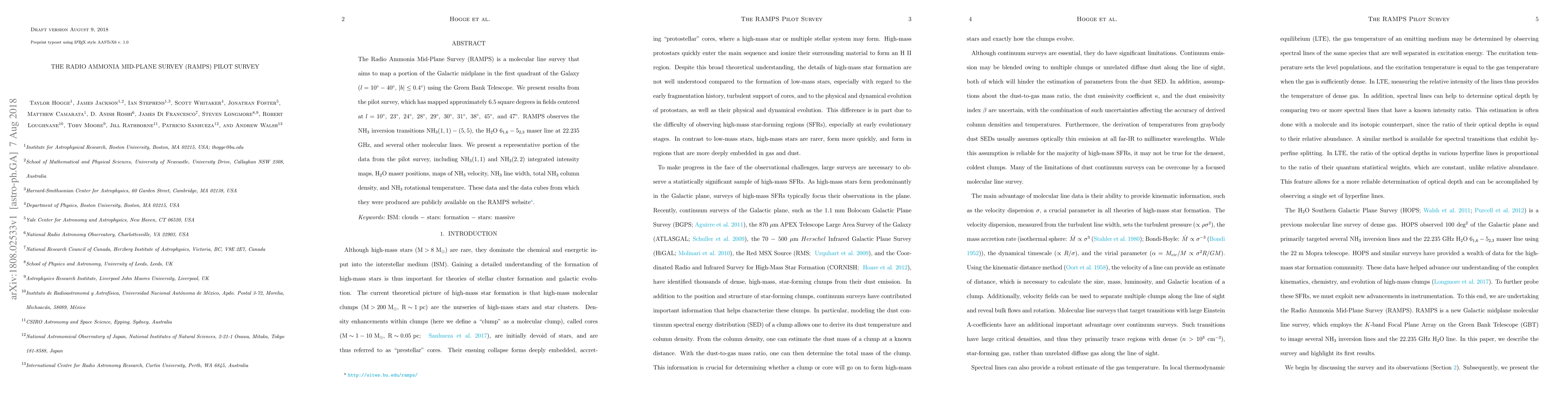 The Radio Ammonia Mid-Plane Survey (RAMPS) is a molecular line survey that aims to map a portion of the Galactic midplane in the first quadrant of the Galaxy (l = 10 deg - 40 deg, |b| < 0.4 deg) using the Green Bank Telescope. We present results from the pilot survey, which has mapped approximately 6.5 square degrees in fields centered at l = 10 deg, 23 deg, 24 deg, 28 deg, 29 deg, 30 deg, 31 deg, 38 deg, 45 deg, and 47 deg. RAMPS observes the NH3 inversion transitions NH3(1, 1) - (5, 5), the H2O 6(1,6) - 5(2,3) maser line at 22.235 GHz, and several other molecular lines. We present a representative portion of the data from the pilot survey, including NH3(1,1) and NH3(2,2) integrated intensity maps, H2O maser positions, maps of NH3 velocity, NH3 line width, total NH3 column density, and NH3 rotational temperature. These data and the data cubes from which they were produced are publicly available on the RAMPS website (http://sites.bu.edu/ramps/).