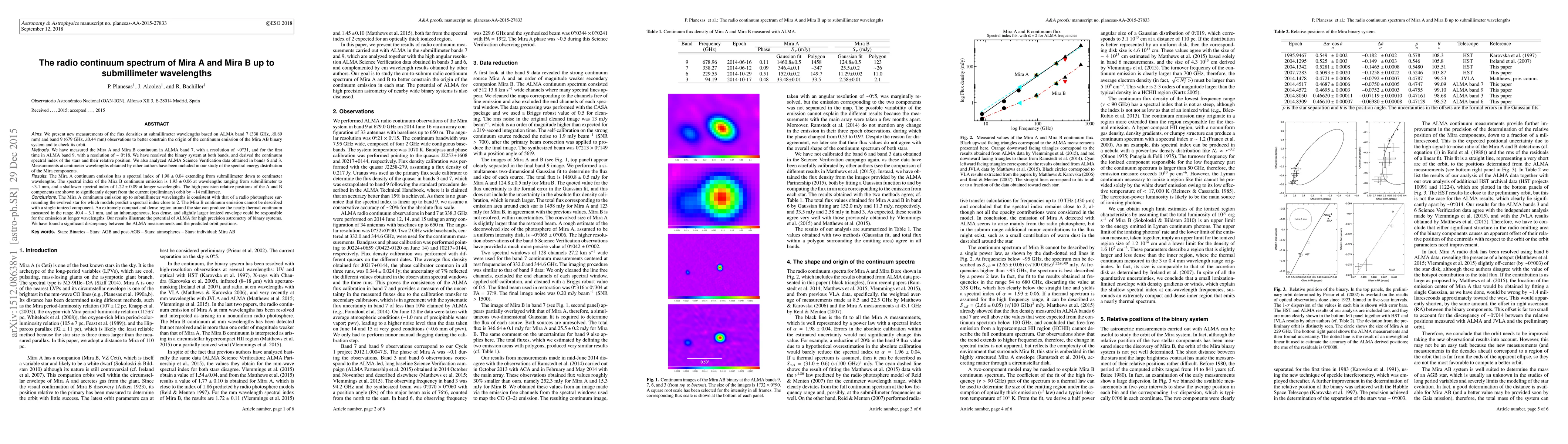 We present new measurements of the flux densities at submillimeter wavelengths based on ALMA band 7 (338 GHz) and band 9 (679 GHz) observations to better constrain the origin of the continuum emission of the Mira AB binary system and to check its orbit. We have measured the Mira A and Mira B continuum in ALMA band 7, with a resolution of ~0"31, and for the first time in ALMA band 9, with a resolution of ~0"18. We resolved the binary system at both bands, and derived the continuum spectral index of the stars and their relative position. We also analyzed ALMA SciVer data obtained in bands 6 and 3. Measurements at centimeter wavelengths obtained by other authors have been included in our study of the spectral energy distribution of the Mira components. The Mira A continuum emission has a spectral index of 1.98+-0.04 extending from submillimeter down to centimeter wavelengths. The spectral index of the Mira B continuum emission is 1.93+-0.06 at wavelengths ranging from submillimeter to ~3.1 mm, and a shallower spectral index of 1.22+-0.09 at longer wavelengths. The Mira A continuum emission up to submillimeter wavelengths is consistent with that of a radio photosphere surrounding the evolved star for which models predict a spectral index close to 2. The Mira B continuum emission cannot be described with a single ionized component. An extremely compact and dense region around the star can produce the nearly thermal continuum measured in the 0.4-3.1 mm wavelength range, and an inhomogeneous, less dense, and slightly larger ionized envelope could be responsible for the emission at longer wavelengths. Our results illustrate the potential of ALMA for high precision astrometry of binary systems. We have found a significant discrepancy of ~14 milliarcsec between the ALMA measurements and the predicted orbit positions.