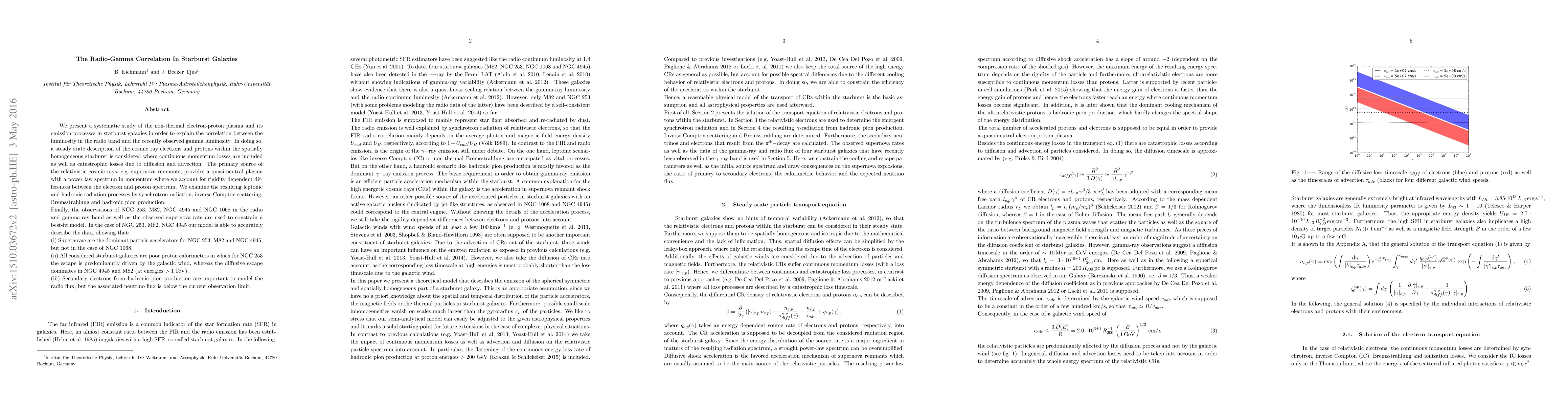 This paper investigates the correlation between radio and gamma luminosity in starburst galaxies, attributing it to non-thermal processes involving cosmic ray electrons and protons. The study finds that supernovae are the primary accelerators for most galaxies, with different escape mechanisms dominating at high energies, and highlights the importance of secondary electrons from pion production in explaining the radio flux.