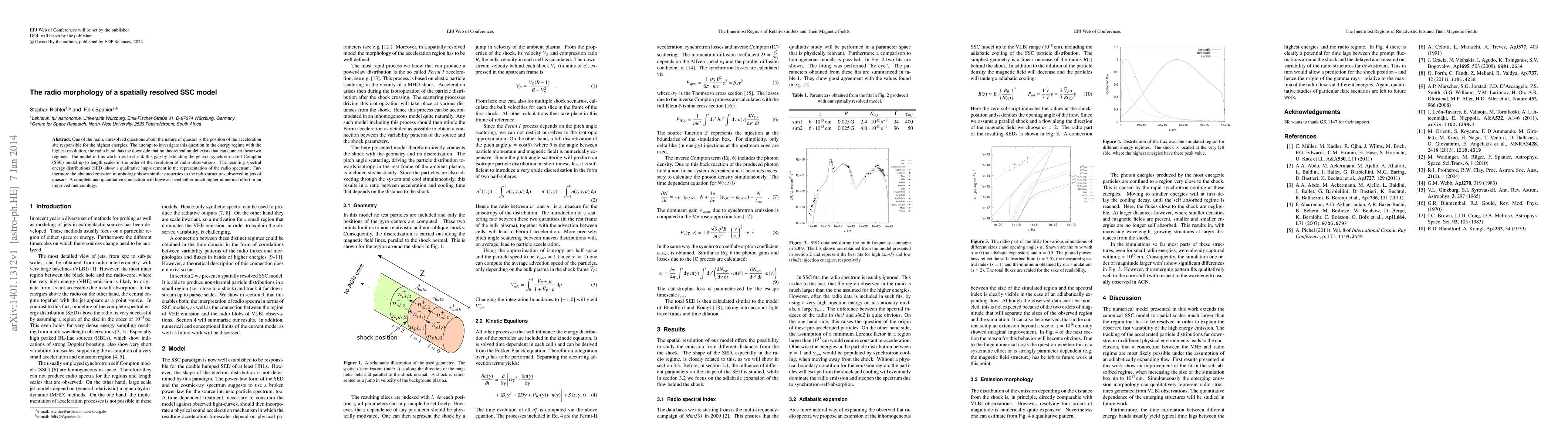 One of the main, unresolved questions about the nature of quasars is the position of the acceleration site responsible for the highest energies. The attempt to investigate this question in the energy regime with the highest resolution, the radio band, has the downside that no theoretical model exists that can connect these two regimes. The model in this work tries to shrink this gap by extending the general synchrotron self Compton (SSC) model up to length scales in the order of the resolution of radio observations. The resulting spectral energy distributions (SED) show a qualitative improvement in the representation of the radio spectrum. Furthermore the obtained emission morphology shows similar properties to the radio structures observed in jets of quasars. A complete and quantitative connection will however need either much higher numerical effort or an improved methodology.