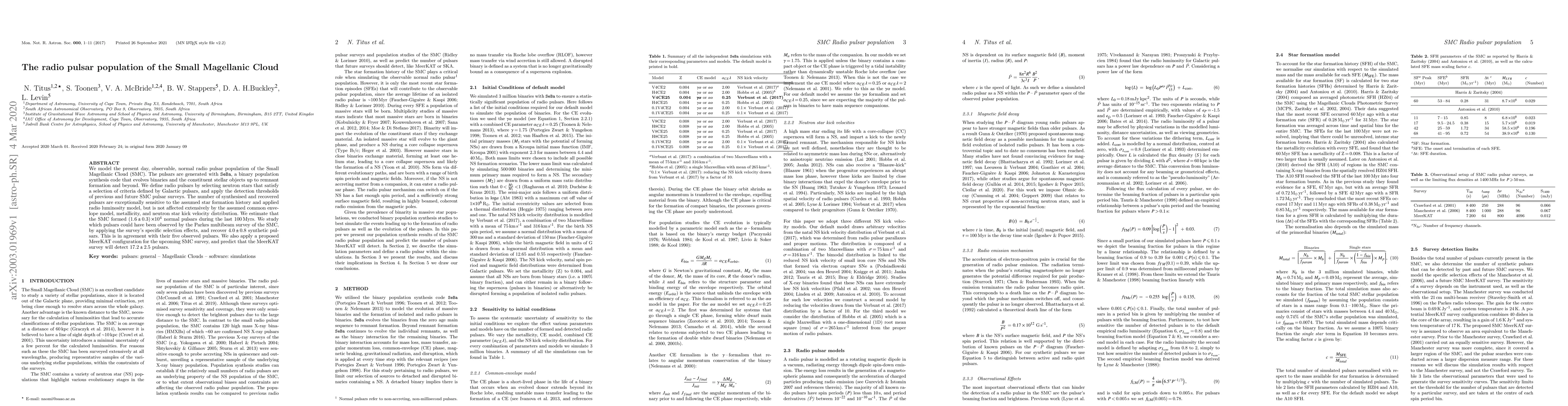 This paper models the radio pulsar population of the Small Magellanic Cloud (SMC) using a binary population synthesis code, estimating (1.6±0.3)×10^4 pulsars formed in the last 100 Myrs. It predicts 4.0±0.8 pulsars detectable by the Parkes survey and anticipates 17.2±2.5 pulsars detectable by the future MeerKAT survey.