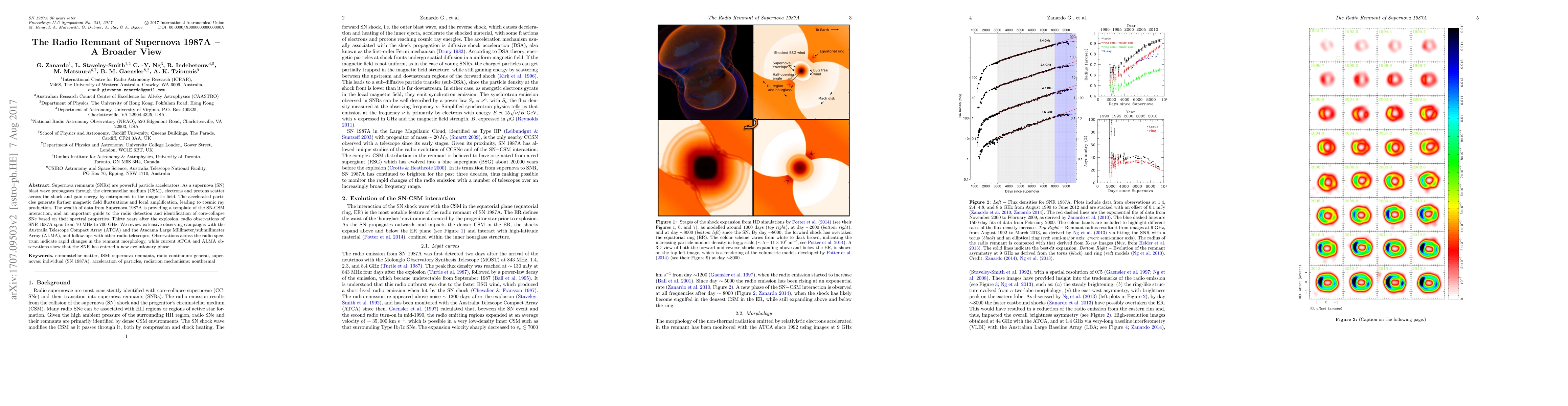 This paper reviews radio observations of the supernova remnant 1987A, highlighting its evolving morphology and new evolutionary phase, based on extensive data from ATCA and ALMA, providing insights into the interaction between supernova blast waves and the circumstellar medium.