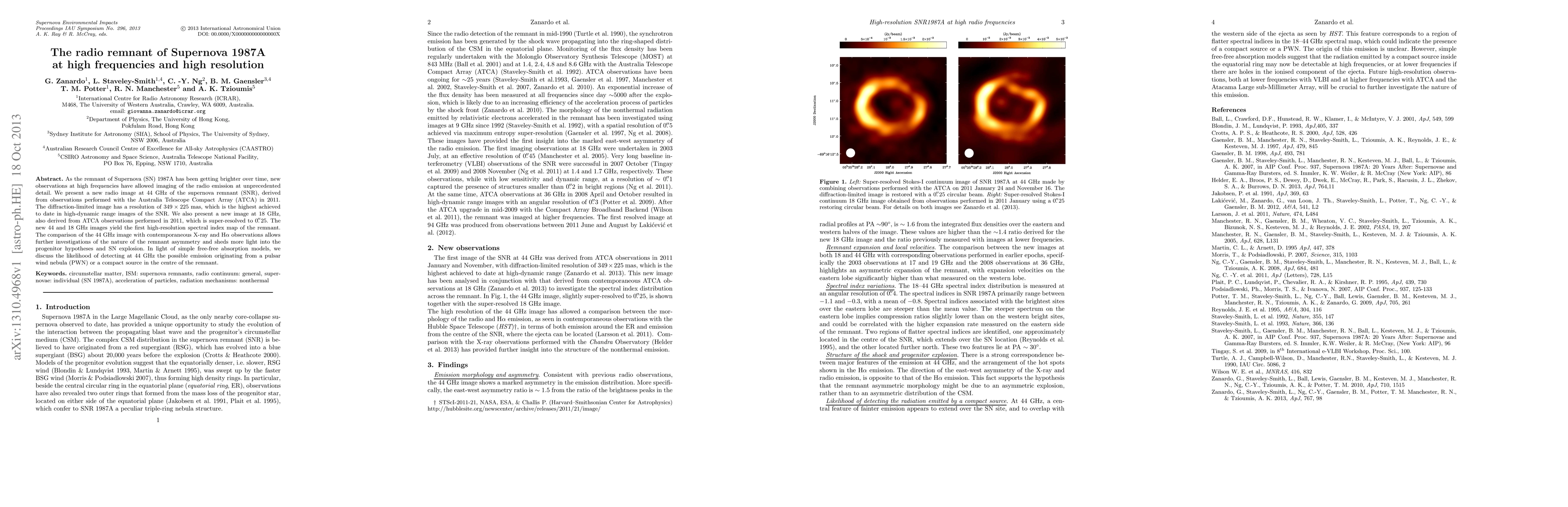 This paper presents high-resolution radio images of Supernova 1987A's remnant at 44 GHz and 18 GHz, revealing unprecedented detail and the first spectral index map. The findings provide insights into the remnant's asymmetry and support discussions about the progenitor and potential pulsar wind nebula emission.
