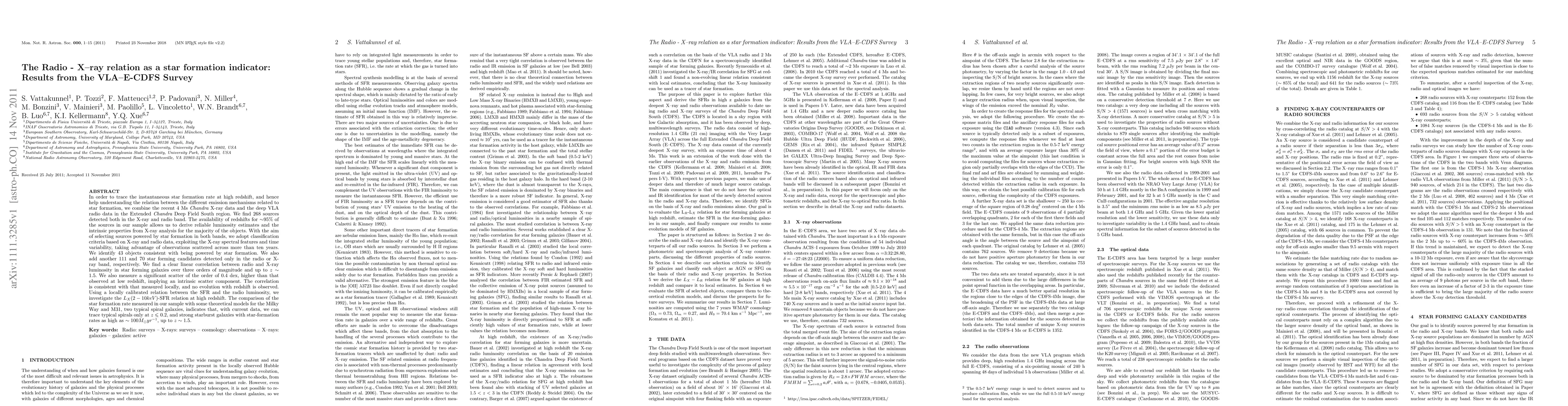 In order to trace the instantaneous star formation rate at high redshift, and hence help understanding the relation between the different emission mechanisms related to star formation, we combine the recent 4 Ms Chandra X-ray data and the deep VLA radio data in the Extended Chandra Deep Field South region. We find 268 sources detected both in the X-ray and radio band. The availability of redshifts for $\sim 95$ of the sources in our sample allows us to derive reliable luminosity estimates and the intrinsic properties from X-ray analysis for the majority of the objects. With the aim of selecting sources powered by star formation in both bands, we adopt classification criteria based on X-ray and radio data, exploiting the X-ray spectral features and time variability, taking advantage of observations scattered across more than ten years. We identify 43 objects consistent with being powered by star formation. We also add another 111 and 70 star forming candidates detected only in the radio or X-ray band, respectively. We find a clear linear correlation between radio and X-ray luminosity in star forming galaxies over three orders of magnitude and up to $z \sim 1.5$. We also measure a significant scatter of the order of 0.4 dex, higher than that observed at low redshift, implying an intrinsic scatter component. The correlation is consistent with that measured locally, and no evolution with redshift is observed. Using a locally calibrated relation between the SFR and the radio luminosity, we investigate the L_X(2-10keV)-SFR relation at high redshift. The comparison of the star formation rate measured in our sample with some theoretical models for the Milky Way and M31, two typical spiral galaxies, indicates that, with current data, we can trace typical spirals only at z<0.2, and strong starburst galaxies with star-formation rates as high as $\sim 100 M_\odot yr^{-1}$, up to $z\sim 1.5$.