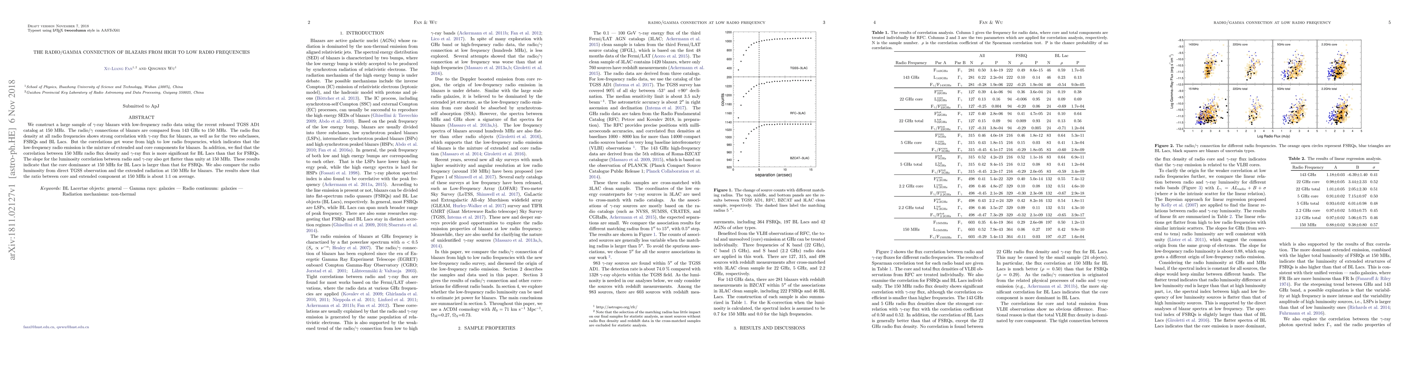 We construct a large sample of gamma-ray blazars with low-frequency radio data using the recent released TGSS AD1 catalog at 150 MHz. The radio/gamma connections of blazars are compared from 143 GHz to 150 MHz. The radio flux density at all radio frequencies shows strong correlation with gamma-ray flux for blazars, as well as for the two subclasses, FSRQs and BL Lacs. But the correlations get worse from high to low radio frequencies, which indicates that the low-frequency radio emission is the mixture of extended and core components for blazars. In addition, we find that the correlation between 150 MHz radio flux density and gamma-ray flux is more significant for BL Lacs than that for FSRQs. The slope for the luminosity correlation between radio and gamma-ray also get flatter than unity at 150 MHz. These results indicate that the core dominance at 150 MHz for BL Lacs is larger than that for FSRQs. We also compare the radio luminosity from direct TGSS observation and the extended radiation at 150 MHz for blazars. The results show that the ratio between core and extended component at 150 MHz is about 1:1 on average.