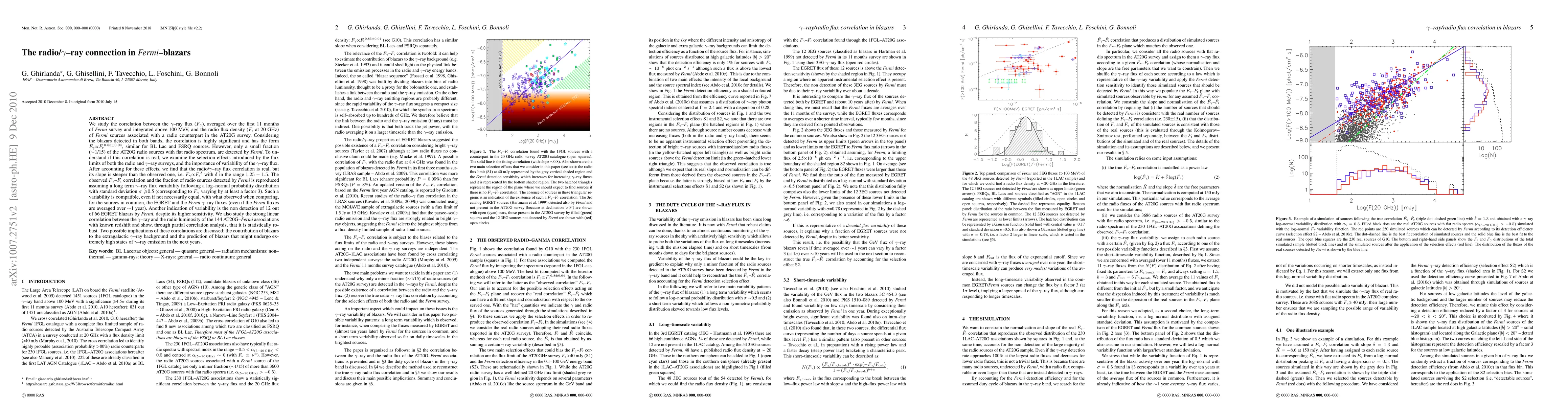 We study the correlation between the gamma-ray flux F_g, averaged over the first 11 months of Fermi survey and integrated above 100 MeV, and the radio flux density (F_r at 20 GHz) of Fermi sources associated with a radio counterpart in the AT20G survey. Considering the blazars detected in both bands, the correlation is highly significant and it is F_g~F_r^0.85+-0.04, similar for BL Lac and FSRQ sources. However, only a small fraction (~1/15) of the AT20G radio sources with flat radio spectrum, are detected by Fermi. To understand if this correlation is real, we examine the selection effects introduced by the flux limits of the radio and gamma-ray surveys, and the importance of variability of the gamma-ray flux. We find that the radio/gamma-ray flux correlation is real, but its slope is steeper than the observed one, i.e. F_g~F_r^delta with delta in the range 1.25-1.5. The observed F_g-F_r correlation and the fraction of radio sources detected by Fermi is reproduced assuming a long term gamma-ray flux variability following a log-normal probability distribution with standard deviation sigma>0.5 (corresponding to F_g varying by at least a factor 3). Such a variability is compatible with what observed when comparing, for the sources in common, the EGRET and the Fermi gamma-ray fluxes (even if the Fermi fluxes are averaged over ~1 year). Another indication of variability is the non detection of 12 out of 66 EGRET blazars by Fermi, despite its higher sensitivity.We also study the strong linear correlation between the gamma-ray and the radio luminosity of the 144 AT20G-Fermi associations with known redshift and show that it is statistically robust. Two possible implications of these correlations are discussed: the contribution of blazars to the extragalactic gamma-ray background and the prediction of blazars that might undergo extremely high states of gamma-ray emission in the next years.