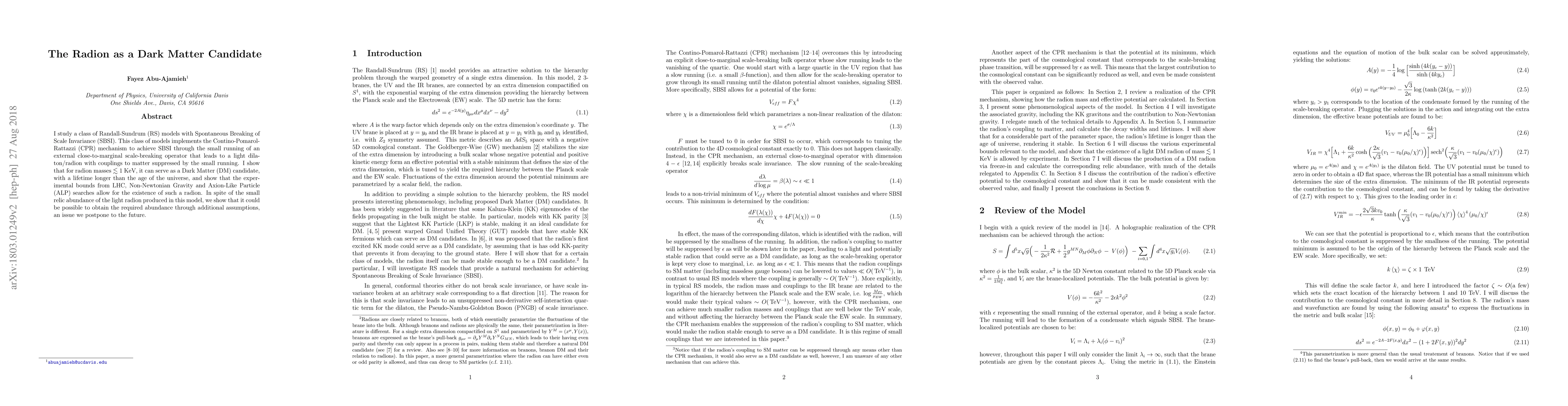 This paper explores Randall-Sundrum models with Spontaneous Breaking of Scale Invariance, proposing a light radion as a viable Dark Matter candidate for masses up to 1 KeV, with suppressed couplings and lifetime exceeding the age of the universe, consistent with current experimental bounds.