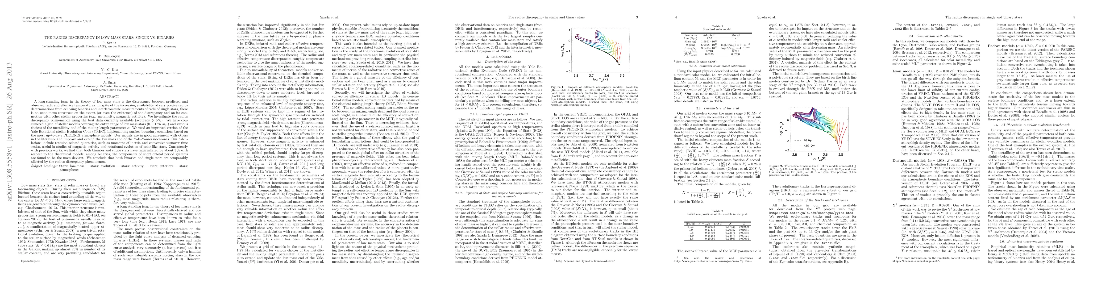 A long-standing issue in the theory of low mass stars is the discrepancy between predicted and observed radii and effective temperatures. In spite of the increasing availability of very precise radius determinations from eclipsing binaries and interferometric measurements of radii of single stars, there is no unanimous consensus on the extent (or even the existence) of the discrepancy and on its connection with other stellar properties (e.g. metallicity, magnetic activity). We investigate the radius discrepancy phenomenon using the best data currently available (accuracy about 5%). We have constructed a grid of stellar models covering the entire range of low mass stars (0.1-1.25 M_sun) and various choices of the metallicity and of the mixing length parameter \alpha. We used an improved version of the Yale Rotational stellar Evolution Code (YREC), implementing surface boundary conditions based on the most up-to-date PHOENIX atmosphere models. Our models are in good agreement with others in the literature and improve and extend the low mass end of the Yale-Yonsei isochrones. Our calculations include rotation-related quantities, such as moments of inertia and convective turnover time scales, useful in studies of magnetic activity and rotational evolution of solar-like stars. Consistently with previous works, we find that both binaries and single stars have radii inflated by about 3% with respect to the theoretical models; among binaries, the components of short orbital period systems are found to be the most deviant. We conclude that both binaries and single stars are comparably affected by the radius discrepancy phenomenon.