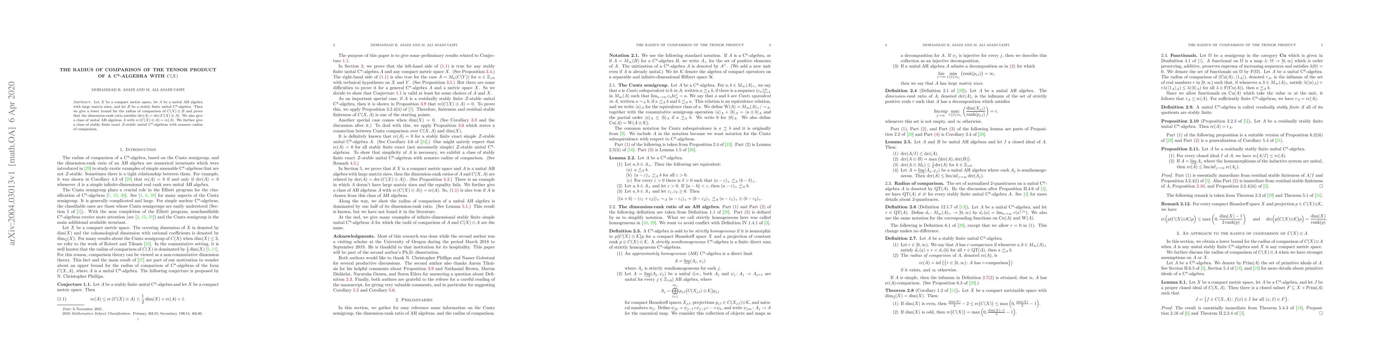 This research paper establishes a lower bound for the radius of comparison of the tensor product C(X) ⊗ B, where X is a compact metric space, A is a unital AH algebra with large matrix sizes, and B is a stably finite unital C*-algebra. It also proves dimension-rank ratio equality and provides classes of unital AH algebras A and stably finite exact Z-stable unital C*-algebras with specific radius of comparison properties.