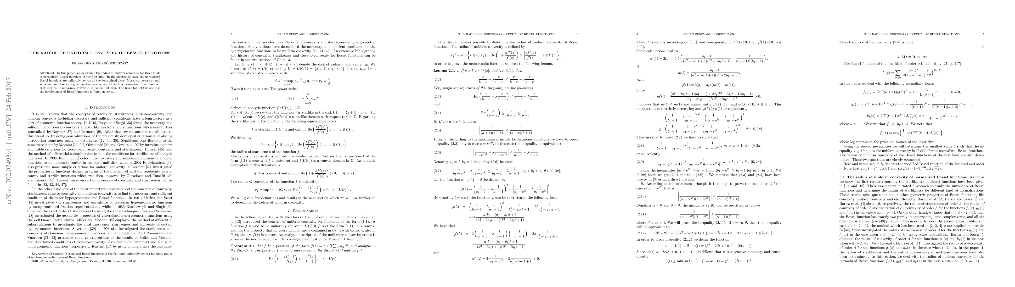 This paper determines the radius of uniform convexity for three types of normalized Bessel functions of the first kind and provides necessary and sufficient conditions for their convexity in the open unit disk, utilizing Bessel functions' function series development as the primary analytical tool.