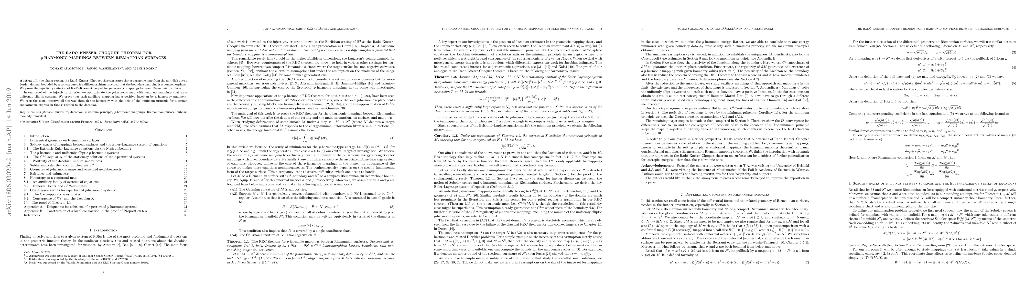 This paper proves the injectivity criterion of the Rad\'o-Kneser-Choquet theorem for $p$-harmonic mappings between Riemannian surfaces, using auxiliary mappings that solve uniformly elliptic systems. The authors demonstrate the positivity of the Jacobian through a homotopy argument and maintain injectivity via the minimum principle for a related subharmonic expression.