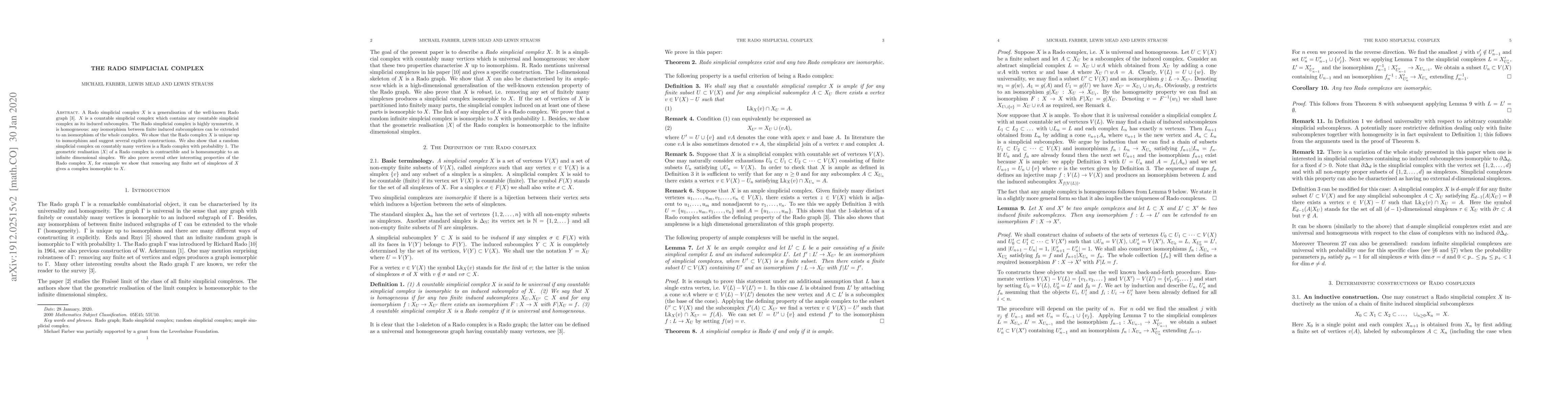 The Rado simplicial complex generalizes the Rado graph and contains any countable simplicial complex as an induced subcomplex. It is unique, highly symmetric, and its geometric realization is contractible and homeomorphic to an infinite-dimensional simplex.