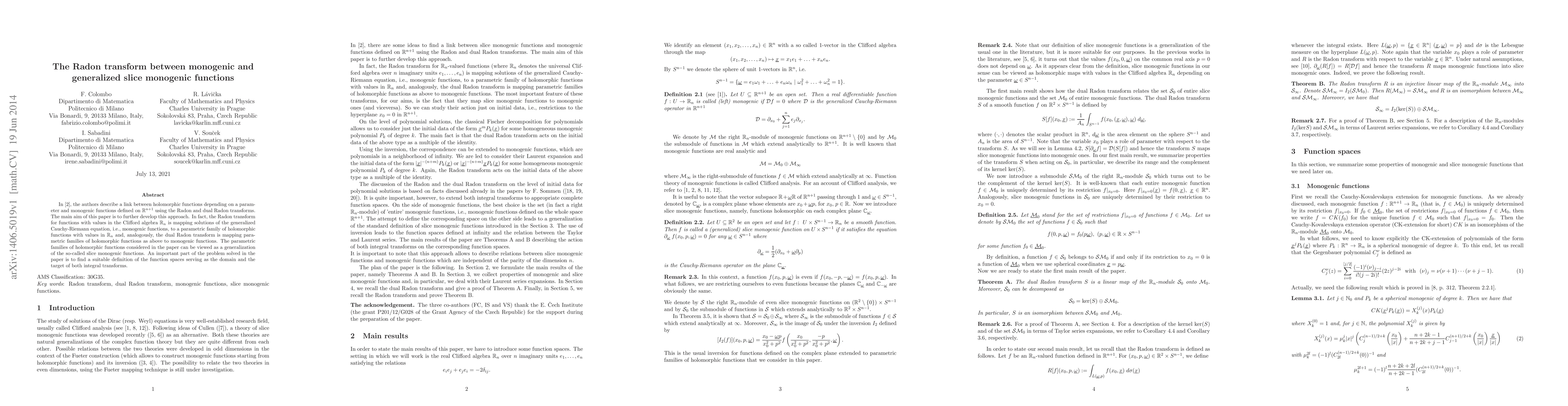 In [J. Bures, R. Lavicka, V. Soucek, Elements of quaternionic analysis and Radon transform, Textos de Matematica 42, Departamento de Matematica, Universidade de Coimbra, 2009], the authors describe a link between holomorphic functions depending on a parameter and monogenic functions defined on R^(n+1) using the Radon and dual Radon transforms. The main aim of this paper is to further develop this approach. In fact, the Radon transform for functions with values in the Clifford algebra R_n is mapping solutions of the generalized Cauchy-Riemann equation, i.e., monogenic functions, to a parametric family of holomorphic functions with values in R_n and, analogously, the dual Radon transform is mapping parametric families of holomorphic functions as above to monogenic functions. The parametric families of holomorphic functions considered in the paper can be viewed as a generalization of the so-called slice monogenic functions. An important part of the problem solved in the paper is to find a suitable definition of the function spaces serving as the domain and the target of both integral transforms.
