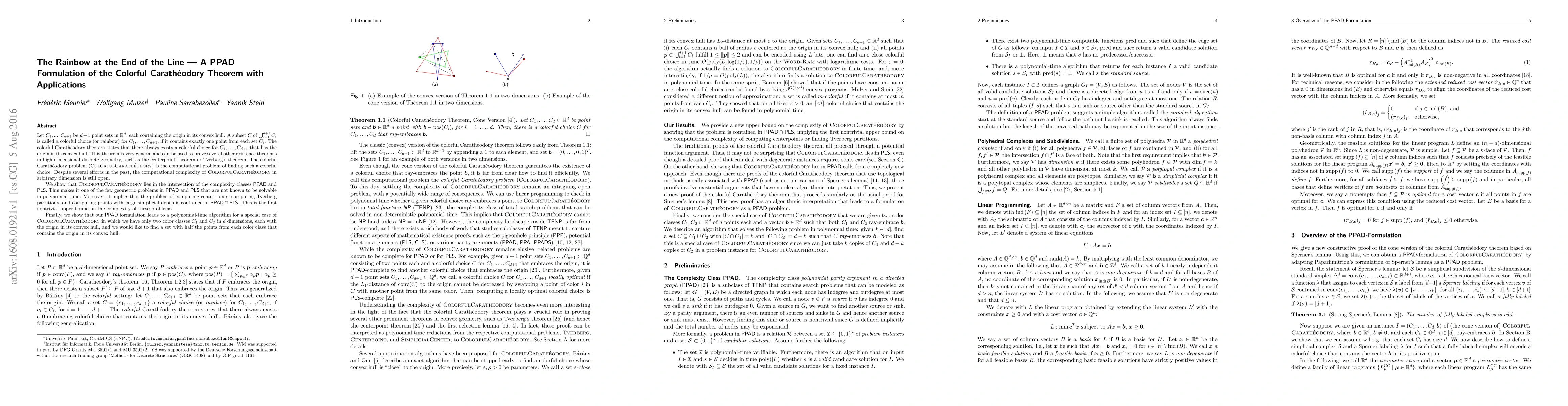 The paper formulates the colorful Carathéodory theorem within the PPAD complexity class, showing that the colorful Carathéodory problem (CCP) lies in PPAD ∩ PLS, providing the first nontrivial upper bound on the complexity of related geometric problems. It also presents a polynomial-time algorithm for a special case of CCP involving two color classes in $d$ dimensions.