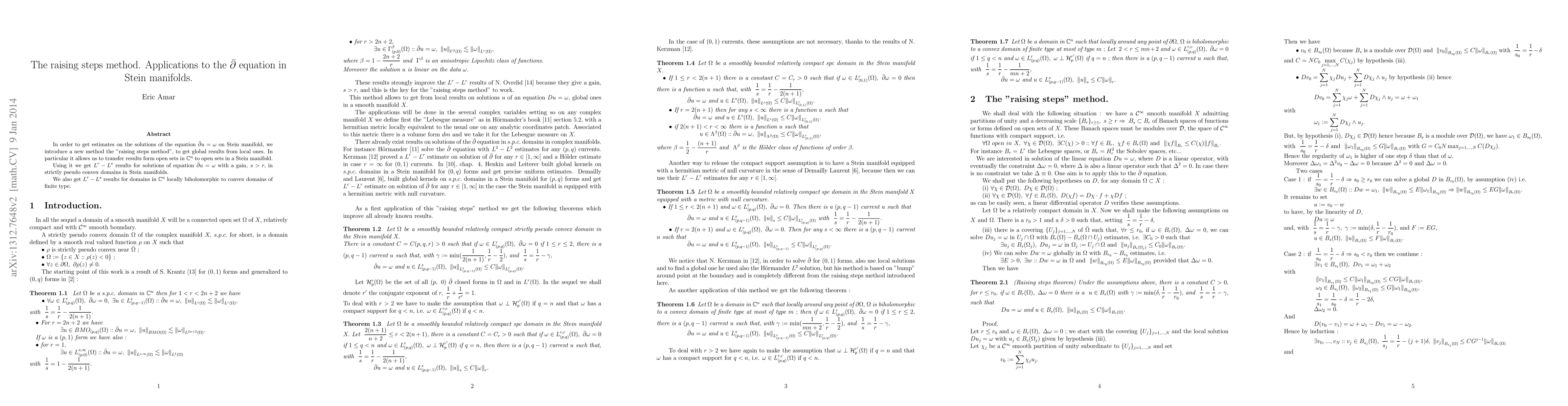 In order to get estimates on the solutions of the equation $\bar \partial u=\omega $ on Stein manifold, we introduce a new method the "raising steps method", to get global results from local ones. In particular it allows us to transfer results form open sets in ${\mathbb{C}}^{n}$ to open sets in a Stein manifold.\ \par Using it we get $\displaystyle L^{r}-L^{s}$ results for solutions of equation $\bar \partial u=\omega $ with a gain, $\displaystyle s>r,$ in strictly pseudo convex domains in Stein manifolds.\ \par We also get $\displaystyle L^{r}-L^{s}$ results for domains in ${\mathbb{C}}^{n}$ locally biholomorphic to convex domains of finite type.