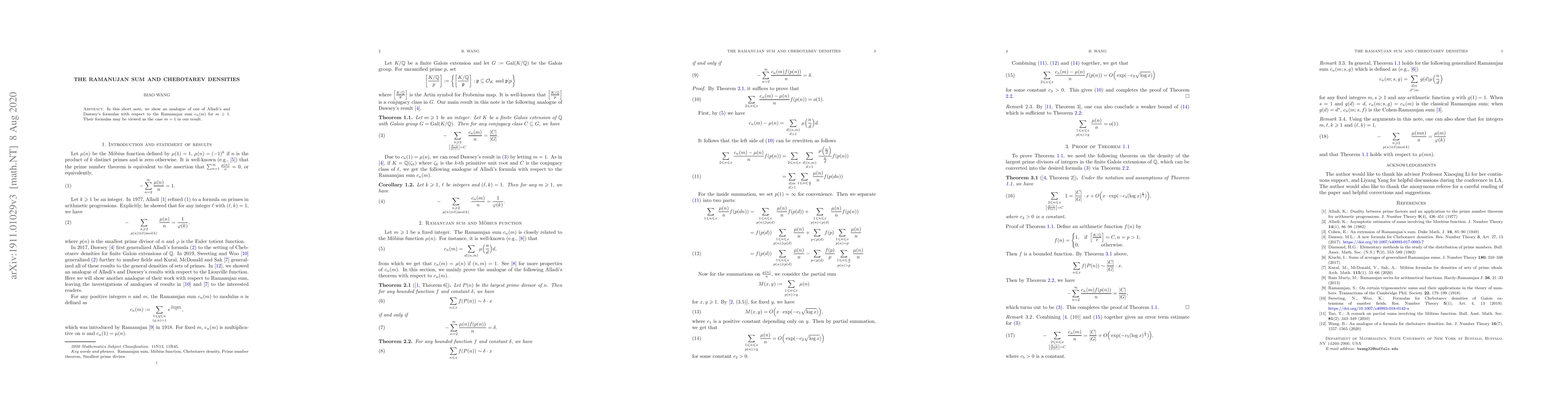 Summary: This paper establishes an analogue of Alladi and Dawsey's formula concerning the Ramanujan sum $c_n(m)$ for $m \geq 1$, extending their result to higher values of $m$. The authors demonstrate the broader applicability of their findings.