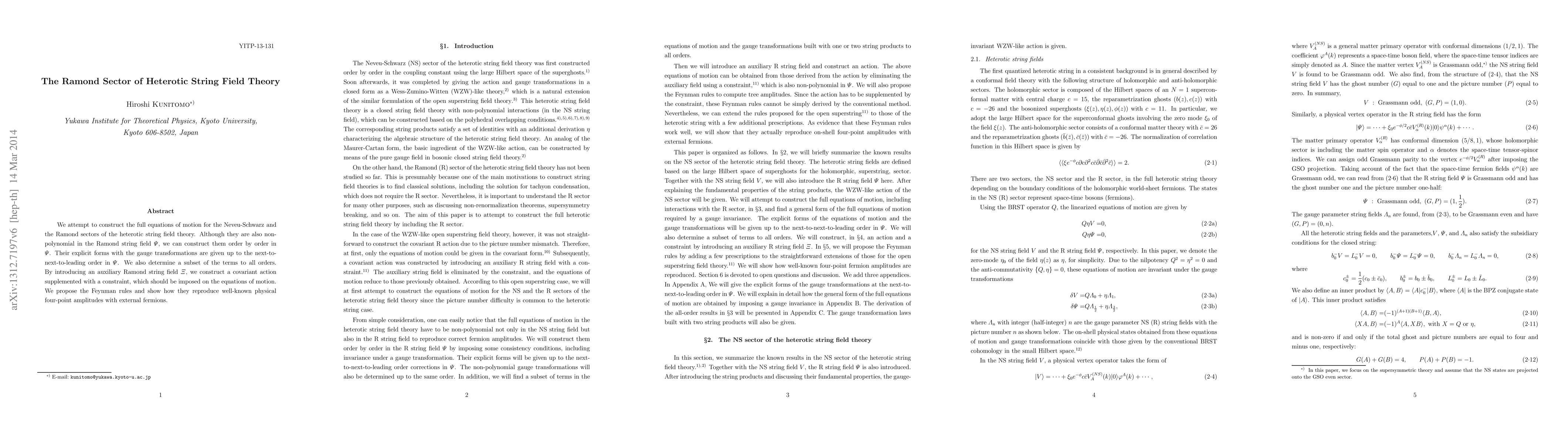 This paper constructs the full equations of motion for the Ramond sector of heterotic string field theory, order by order in the Ramond string field $\Psi$. It introduces an auxiliary field $\Xi$ to construct a covariant action with a constraint, and proposes Feynman rules that reproduce known four-point amplitudes with external fermions.