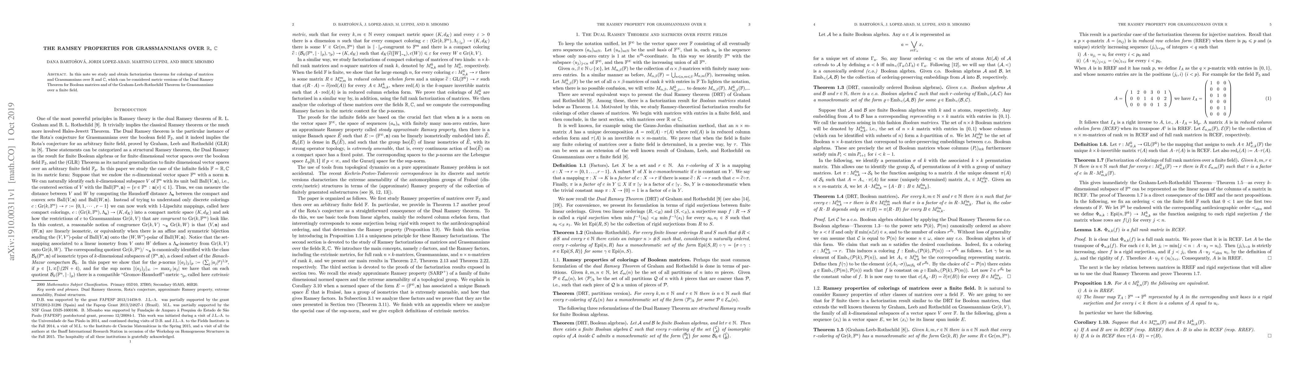 This paper presents factorization theorems for colorings of matrices and Grassmannians over real and complex fields, providing metric analogues of the Dual Ramsey Theorem and the Graham-Leeb-Rothschild Theorem for finite fields.