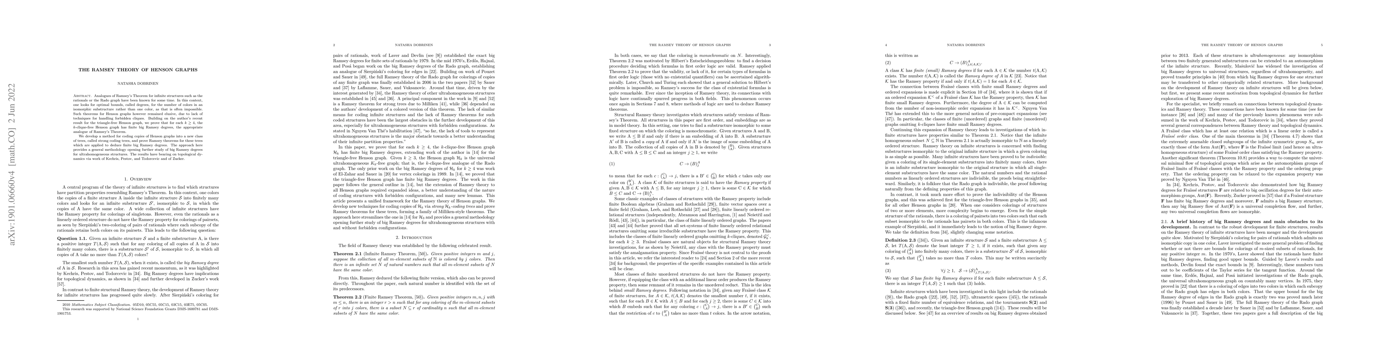 Analogues of Ramsey's Theorem for infinite structures such as the rationals or the Rado graph have been known for some time. In this context, one looks for optimal bounds, called degrees, for the number of colors in an isomorphic substructure rather than one color, as that is often impossible. Such theorems for Henson graphs however remained elusive, due to lack of techniques for handling forbidden cliques. Building on the author's recent result for the triangle-free Henson graph, we prove that for each $k\ge 4$, the $k$-clique-free Henson graph has finite big Ramsey degrees, the appropriate analogue of Ramsey's Theorem. We develop a method for coding copies of Henson graphs into a new class of trees, called strong coding trees, and prove Ramsey theorems for these trees which are applied to deduce finite big Ramsey degrees. The approach here provides a general methodology opening further study of big Ramsey degrees for ultrahomogeneous structures. The results have bearing on topological dynamics via work of Kechris, Pestov, and Todorcevic and of Zucker.