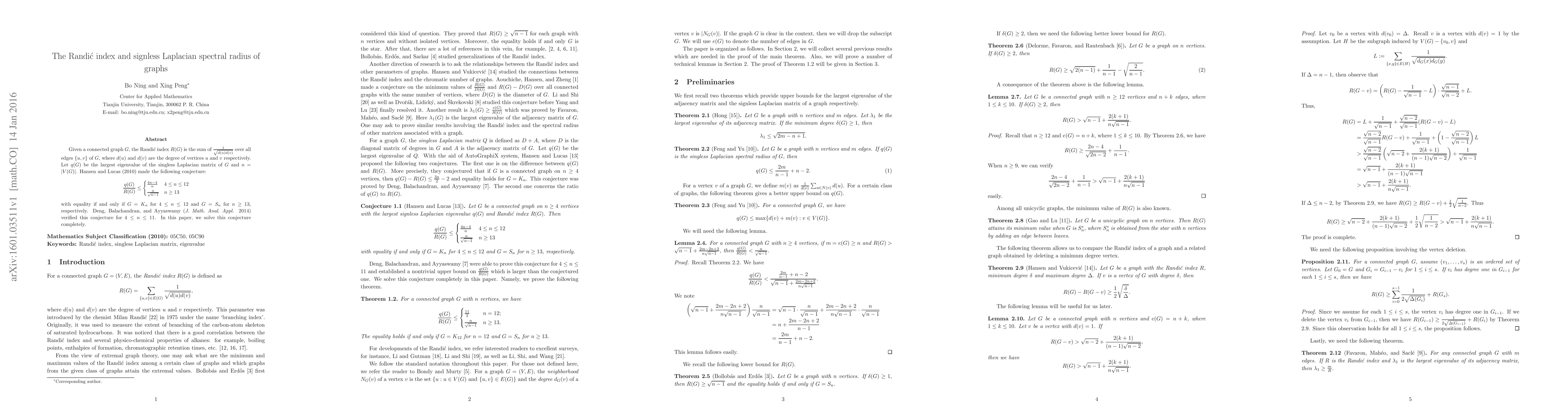 Given a connected graph $G$, the Randi\'c index $R(G)$ is the sum of $\tfrac{1}{\sqrt{d(u)d(v)}}$ over all edges $\{u,v\}$ of $G$, where $d(u)$ and $d(v)$ are the degree of vertices $u$ and $v$ respectively. Let $q(G)$ be the largest eigenvalue of the singless Laplacian matrix of $G$ and $n=|V(G)|$. Hansen and Lucas (2010) made the following conjecture: \[ \frac{q(G)}{R(G)} \leq \begin{cases} \frac{4n-4}{n} & 4 \leq n\leq 12 \frac{n}{\sqrt{n-1}} & n\geq 13 \end{cases} \] with equality if and only if $G=K_{n}$ for $4\leq n\leq 12$ and $G=S_n$ for $n\geq 13$, respectively. Deng, Balachandran, and Ayyaswamy (J. Math. Anal. Appl. 2014) verified this conjecture for $4 \leq n \leq 11$. In this paper, we solve this conjecture completely.