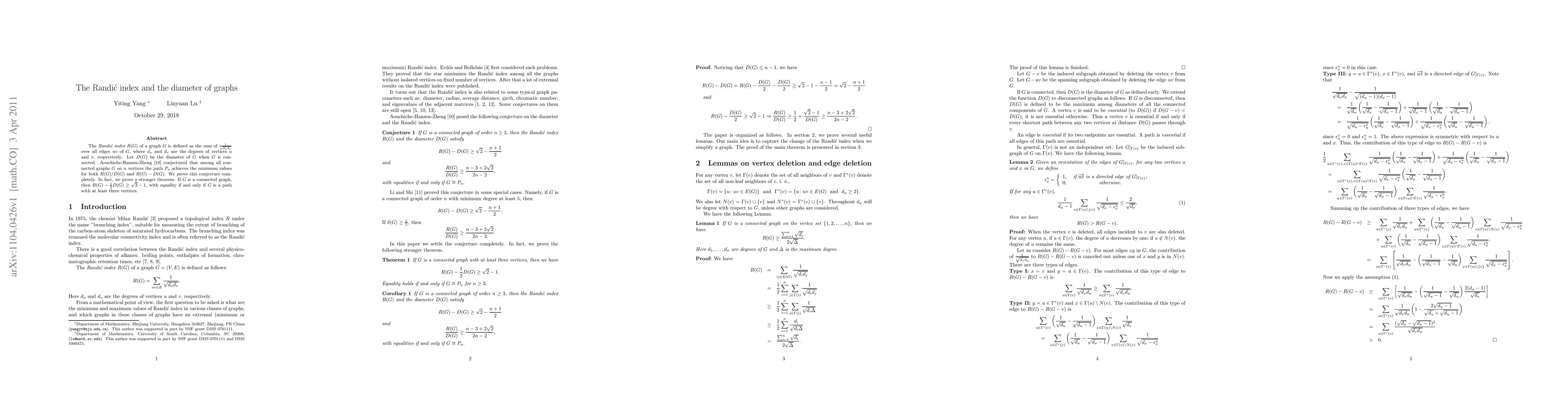 The {\it Randi\'c index} $R(G)$ of a graph $G$ is defined as the sum of 1/\sqrt{d_ud_v} over all edges $uv$ of $G$, where $d_u$ and $d_v$ are the degrees of vertices $u$ and $v,$ respectively. Let $D(G)$ be the diameter of $G$ when $G$ is connected. Aouchiche-Hansen-Zheng conjectured that among all connected graphs $G$ on $n$ vertices the path $P_n$ achieves the minimum values for both $R(G)/D(G)$ and $R(G)- D(G)$. We prove this conjecture completely. In fact, we prove a stronger theorem: If $G$ is a connected graph, then $R(G)-(1/2)D(G)\geq \sqrt{2}-1$, with equality if and only if $G$ is a path with at least three vertices.