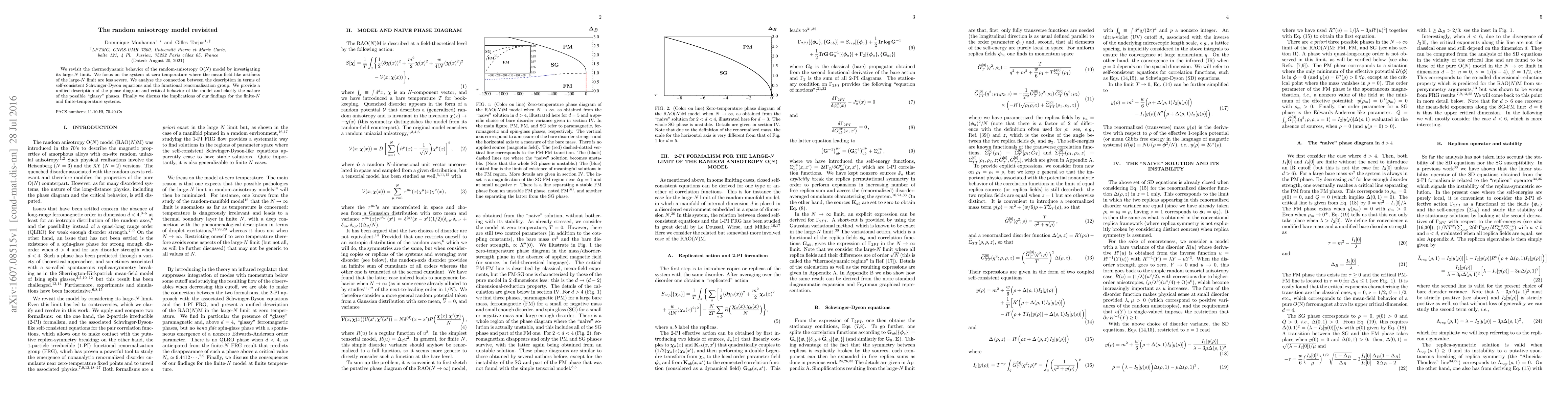 This paper revisits the thermodynamic behavior of the random-anisotropy O($N$) model in its large-$N$ limit, focusing on zero temperature to mitigate mean-field artifacts. It unifies descriptions using self-consistent Schwinger-Dyson equations and functional renormalization group, clarifying the nature of potential "glassy" phases and implications for finite-$N$ and temperature systems.