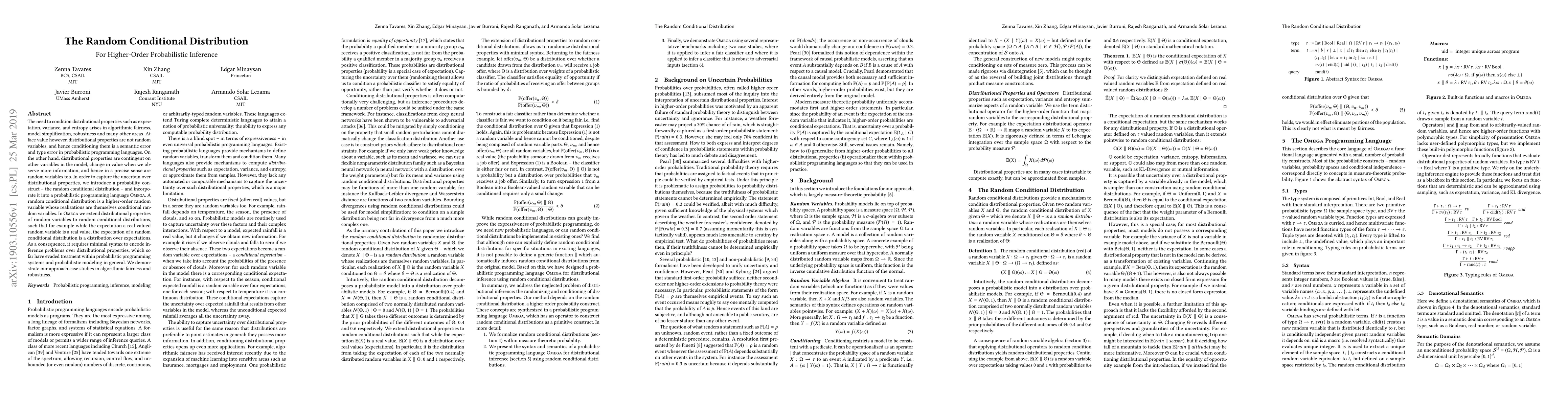 The need to condition distributional properties such as expectation, variance, and entropy arises in algorithmic fairness, model simplification, robustness and many other areas. At face value however, distributional properties are not random variables, and hence conditioning them is a semantic error and type error in probabilistic programming languages. On the other hand, distributional properties are contingent on other variables in the model, change in value when we observe more information, and hence in a precise sense are random variables too. In order to capture the uncertain over distributional properties, we introduce a probability construct -- the random conditional distribution -- and incorporate it into a probabilistic programming language Omega. A random conditional distribution is a higher-order random variable whose realizations are themselves conditional random variables. In Omega we extend distributional properties of random variables to random conditional distributions, such that for example while the expectation a real valued random variable is a real value, the expectation of a random conditional distribution is a distribution over expectations. As a consequence, it requires minimal syntax to encode inference problems over distributional properties, which so far have evaded treatment within probabilistic programming systems and probabilistic modeling in general. We demonstrate our approach case studies in algorithmic fairness and robustness.