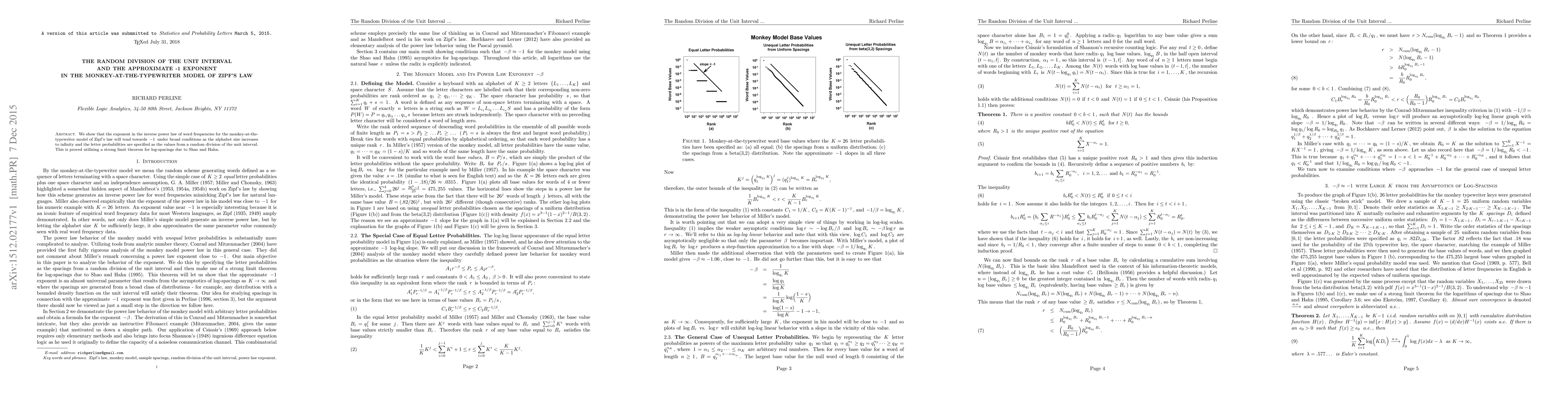 We show that the exponent in the inverse power law of word frequencies for the monkey-at-the-typewriter model of Zipf's law will tend towards -1 under broad conditions as the alphabet size increases to infinity and the letter probabilities are specified as the values from a random division of the unit interval. This is proved utilizing a strong limit theorem for log-spacings due to Shao and Hahn.