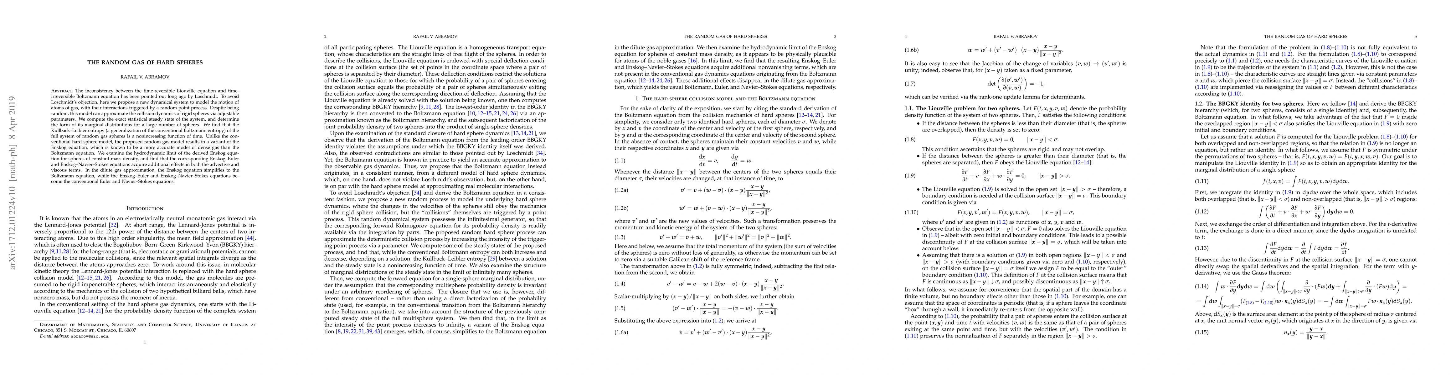 The inconsistency between the time-reversible Liouville equation and time-irreversible Boltzmann equation has been pointed out long ago by Loschmidt. To avoid Loschmidt's objection, here we propose a new dynamical system to model the motion of atoms of gas, with their interactions triggered by a random point process. Despite being random, this model can approximate the collision dynamics of rigid spheres via adjustable parameters. We compute the exact statistical steady state of the system, and determine the form of its marginal distributions for a large number of spheres. We find that the Kullback-Leibler entropy (a generalization of the conventional Boltzmann entropy) of the full system of random gas spheres is a nonincreasing function of time. Unlike the conventional hard sphere model, the proposed random gas model results in a variant of the Enskog equation, which is known to be a more accurate model of dense gas than the Boltzmann equation. We examine the hydrodynamic limit of the derived Enskog equation for spheres of constant mass density, and find that the corresponding Enskog-Euler and Enskog-Navier-Stokes equations acquire additional effects in both the advective and viscous terms. In the dilute gas approximation, the Enskog equation simplifies to the Boltzmann equation, while the Enskog-Euler and Enskog-Navier-Stokes equations become the conventional Euler and Navier-Stokes equations.