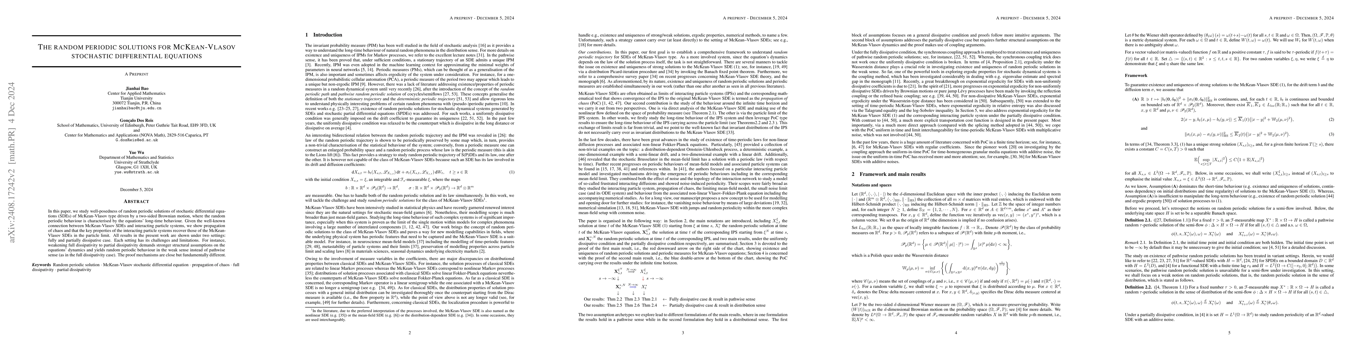 This paper examines the existence and uniqueness of random periodic solutions for McKean-Vlasov stochastic differential equations driven by two-sided Brownian motion, demonstrating propagation of chaos and recovery of interacting particle system properties in the particle limit. Results are presented for both fully and partially dissipative settings, highlighting differences in assumptions and proof techniques between the two.