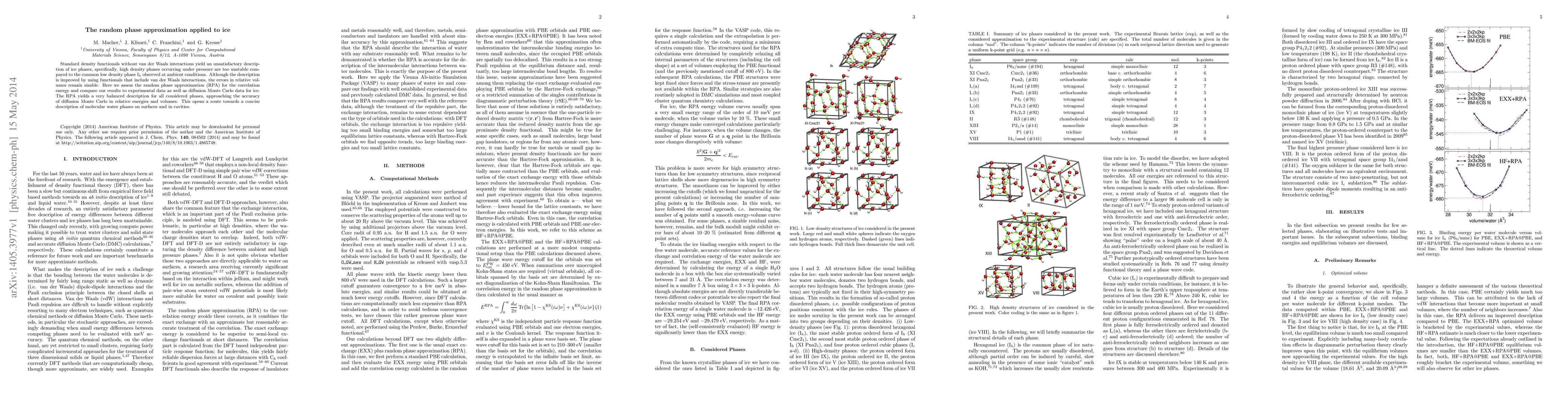 The random phase approximation (RPA) provides a more accurate description of ice phases compared to standard density functionals, especially for high-density phases under pressure, aligning closely with experimental and diffusion Monte Carlo data. This approach offers a promising method for studying molecular water phases in various environments.