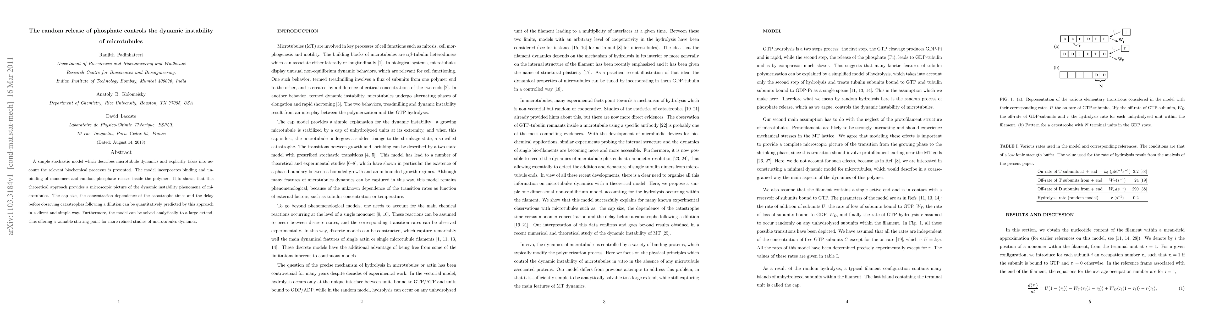 This paper presents a stochastic model explaining microtubule dynamics, focusing on the role of random phosphate release in controlling dynamic instability. The model accurately predicts cap size, concentration effects on catastrophe times, and delays in catastrophes following dilution, offering a valuable analytical framework for further studies.