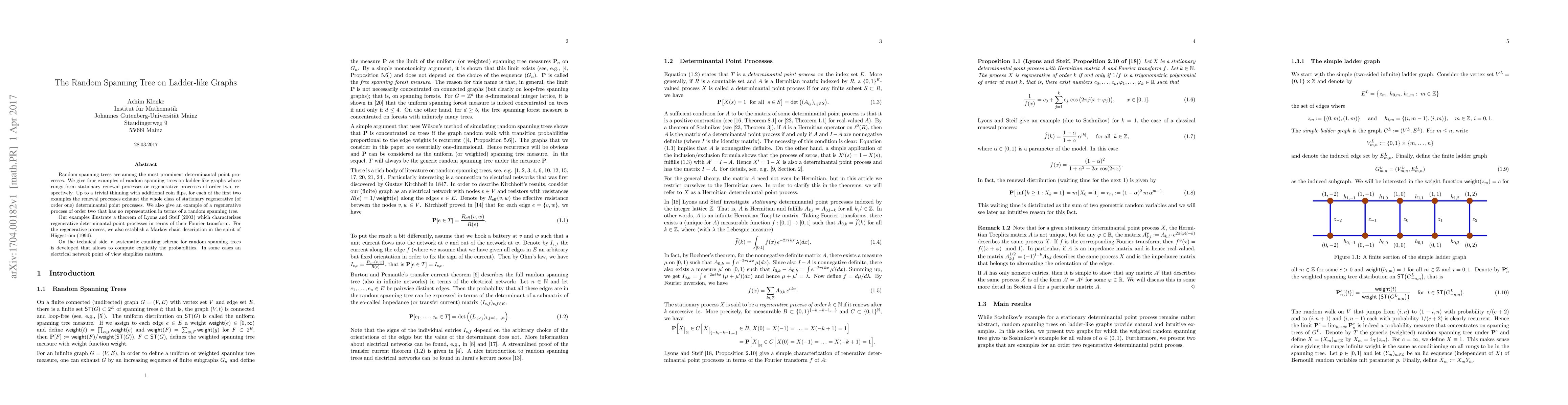 This paper examines random spanning trees on ladder-like graphs, showing how they relate to stationary renewal and regenerative processes. It develops a systematic counting scheme for these trees and discusses their representation in terms of determinantal point processes, supporting the results with Fourier transform analysis and Markov chain descriptions.