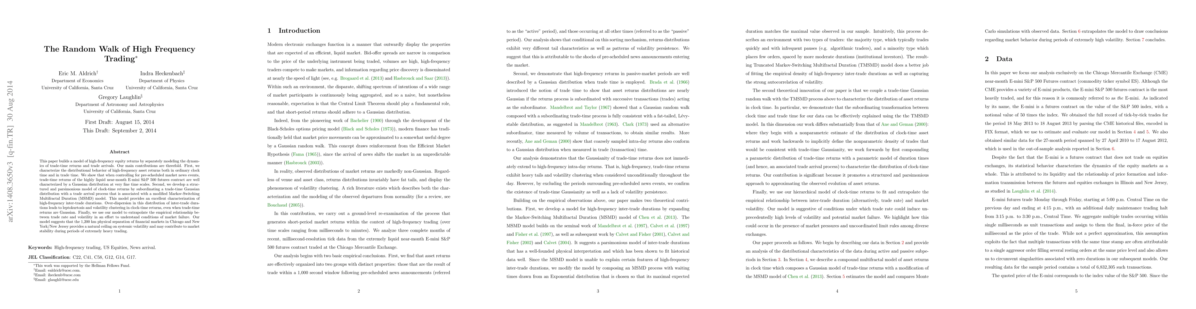 This paper builds a model of high-frequency equity returns by separately modeling the dynamics of trade-time returns and trade arrivals. Our main contributions are threefold. First, we characterize the distributional behavior of high-frequency asset returns both in ordinary clock time and in trade time. We show that when controlling for pre-scheduled market news events, trade-time returns of the highly liquid near-month E-mini S&P 500 futures contract are well characterized by a Gaussian distribution at very fine time scales. Second, we develop a structured and parsimonious model of clock-time returns by subordinating a trade-time Gaussian distribution with a trade arrival process that is associated with a modified Markov-Switching Multifractal Duration (MSMD) model. This model provides an excellent characterization of high-frequency inter-trade durations. Over-dispersion in this distribution of inter-trade durations leads to leptokurtosis and volatility clustering in clock-time returns, even when trade-time returns are Gaussian. Finally, we use our model to extrapolate the empirical relationship between trade rate and volatility in an effort to understand conditions of market failure. Our model suggests that the 1,200 km physical separation of financial markets in Chicago and New York/New Jersey provides a natural ceiling on systemic volatility and may contribute to market stability during periods of extremely heavy trading.