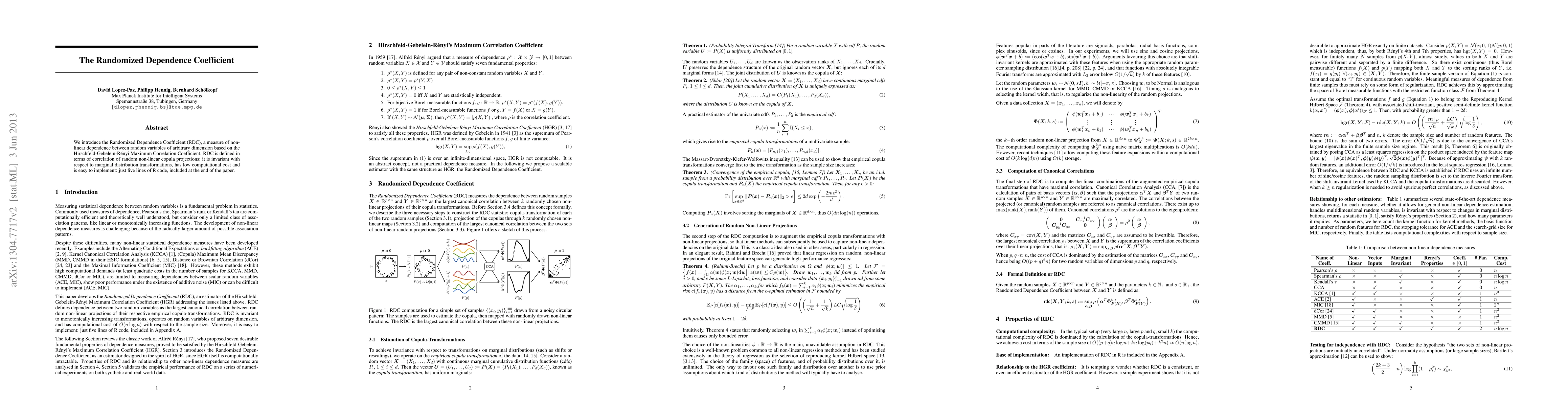 We introduce the Randomized Dependence Coefficient (RDC), a measure of non-linear dependence between random variables of arbitrary dimension based on the Hirschfeld-Gebelein-R\'enyi Maximum Correlation Coefficient. RDC is defined in terms of correlation of random non-linear copula projections; it is invariant with respect to marginal distribution transformations, has low computational cost and is easy to implement: just five lines of R code, included at the end of the paper.