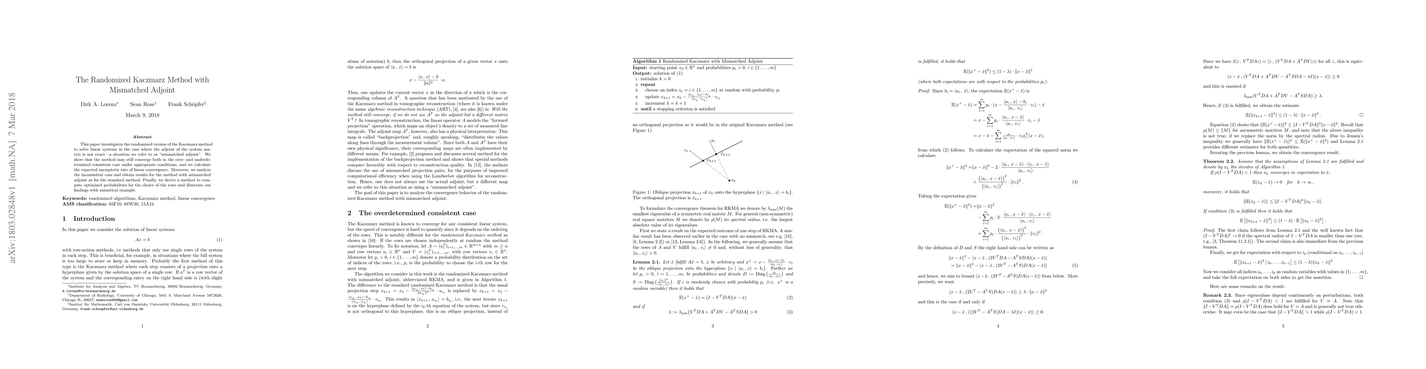 This paper investigates the randomized version of the Kaczmarz method to solve linear systems in the case where the adjoint of the system matrix is not exact---a situation we refer to as "mismatched adjoint". We show that the method may still converge both in the over- and underdetermined consistent case under appropriate conditions, and we calculate the expected asymptotic rate of linear convergence. Moreover, we analyze the inconsistent case and obtain results for the method with mismatched adjoint as for the standard method. Finally, we derive a method to compute optimized probabilities for the choice of the rows and illustrate our findings with numerical example.