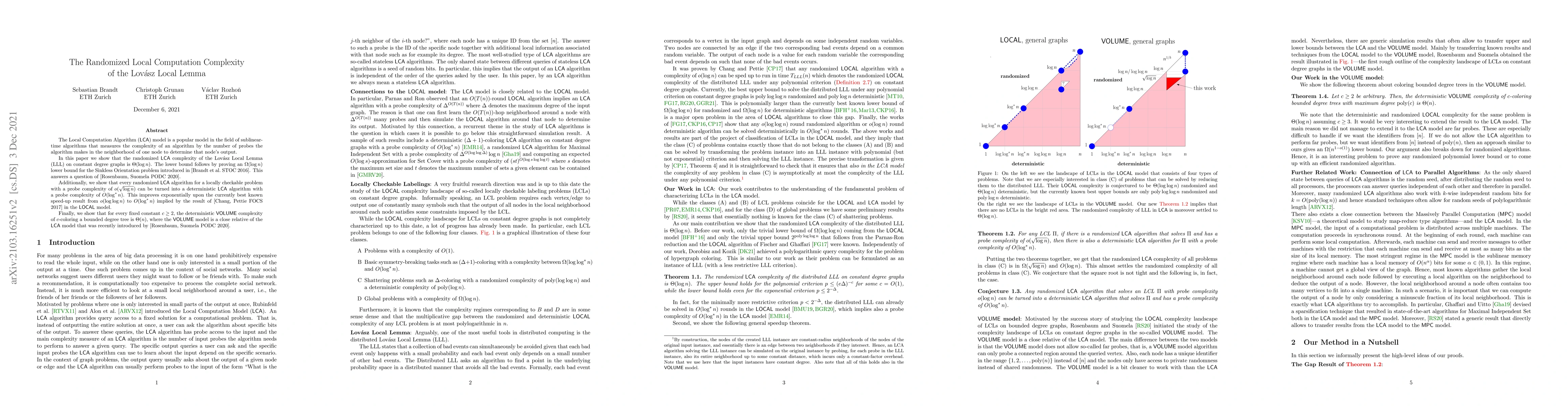 This paper investigates the randomized Local Computation Algorithm (LCA) complexity of the Lovász Local Lemma (LLL) on constant degree graphs, demonstrating it is $\Theta(\log n)$. It also presents a method to convert randomized LCA algorithms for locally checkable problems into deterministic LCA algorithms with improved probe complexity, enhancing the best known speed-up result. Additionally, it establishes the deterministic VOLUME complexity for $c$-coloring bounded degree trees as $\Theta(n)$.