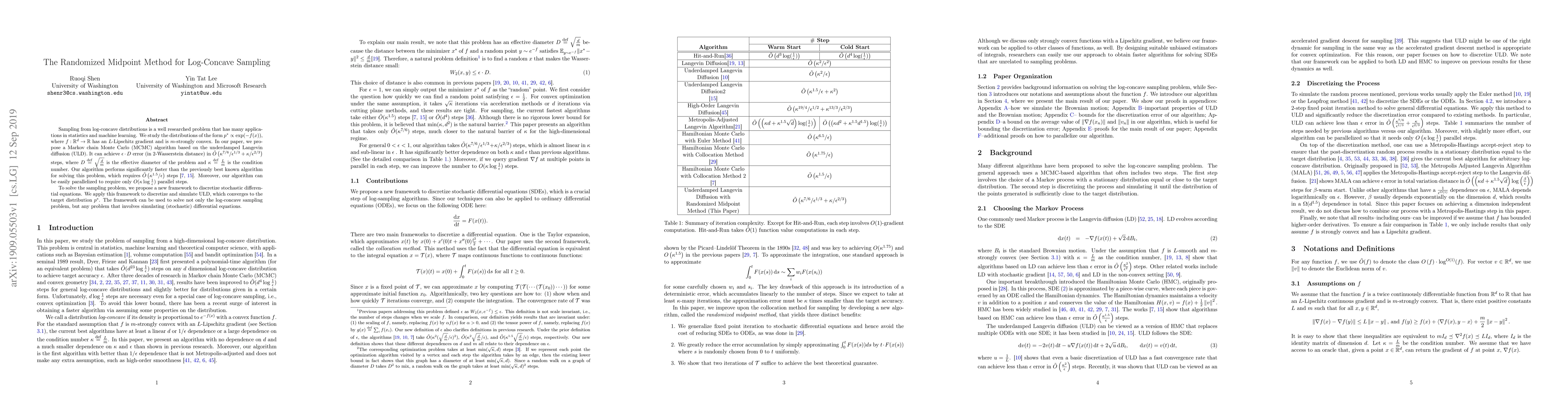 The paper proposes a Markov Chain Monte Carlo (MCMC) algorithm based on the underdamped Langevin diffusion (ULD) for sampling from log-concave distributions with Lipschitz gradient and strong convexity properties.