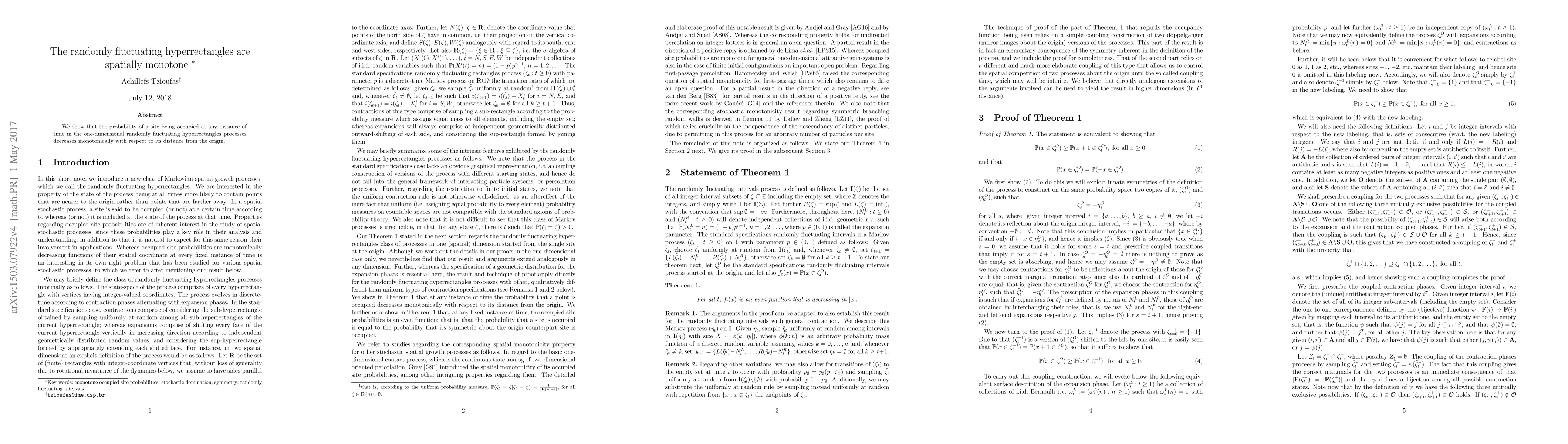 Summary: This paper demonstrates that in one-dimensional randomly fluctuating hyperrectangles, the likelihood of a site being occupied decreases monotonically with its distance from the origin. The study highlights the spatial monotonicity of these processes over time.