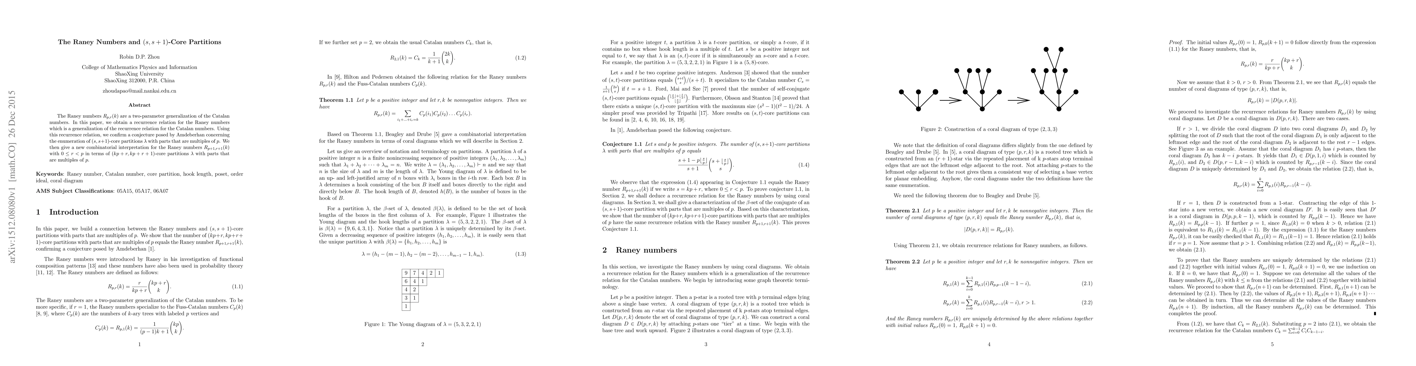 The research derives a recurrence relation for Raney numbers, a two-parameter generalization of Catalan numbers, using coral diagrams and confirms a conjecture on $(s,s+1)$-core partitions with parts that are multiples of $p$.
