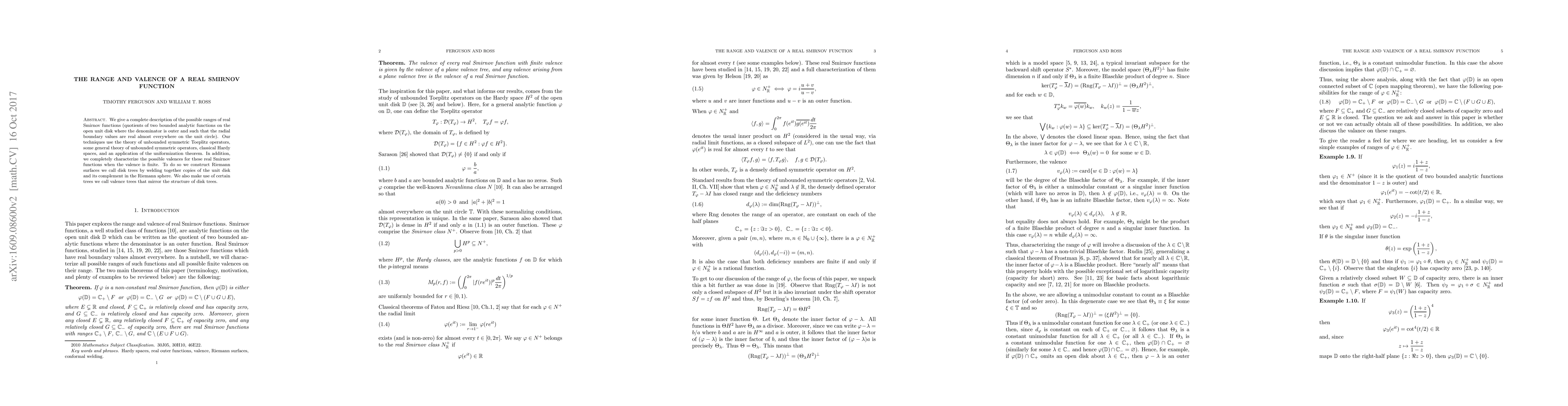 This paper provides a comprehensive analysis of real Smirnov functions, detailing their possible ranges and finite valences using techniques from unbounded symmetric Toeplitz operators, Hardy spaces, and the construction of Riemann surfaces called disk trees and valence trees.