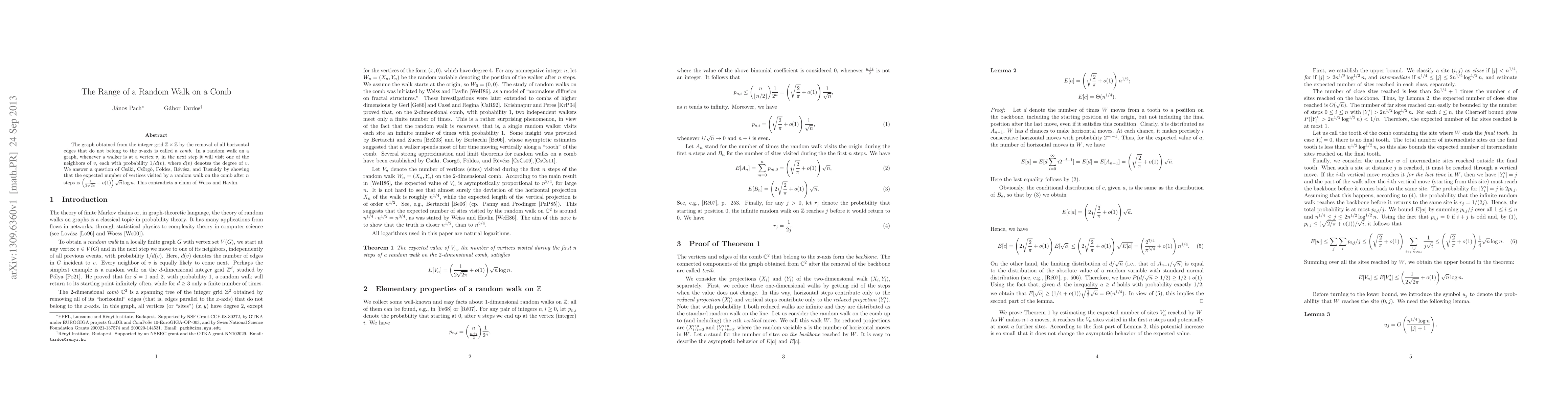 The graph obtained from the integer grid Z x Z by the removal of all horizontal edges that do not belong to the x-axis is called a comb. In a random walk on a graph, whenever a walker is at a vertex v, in the next step it will visit one of the neighbors of v, each with probability 1/d(v), where d(v) denotes the degree of v. We answer a question of Cs\'aki, Cs\"org\"o, F\"oldes, R\'ev\'esz, and Tusn\'ady by showing that the expected number of vertices visited by a random walk on the comb after n steps is (1/(2\sqrt{2\pi})+o(1))\sqrt n\log n. This contradicts a claim of Weiss and Havlin.