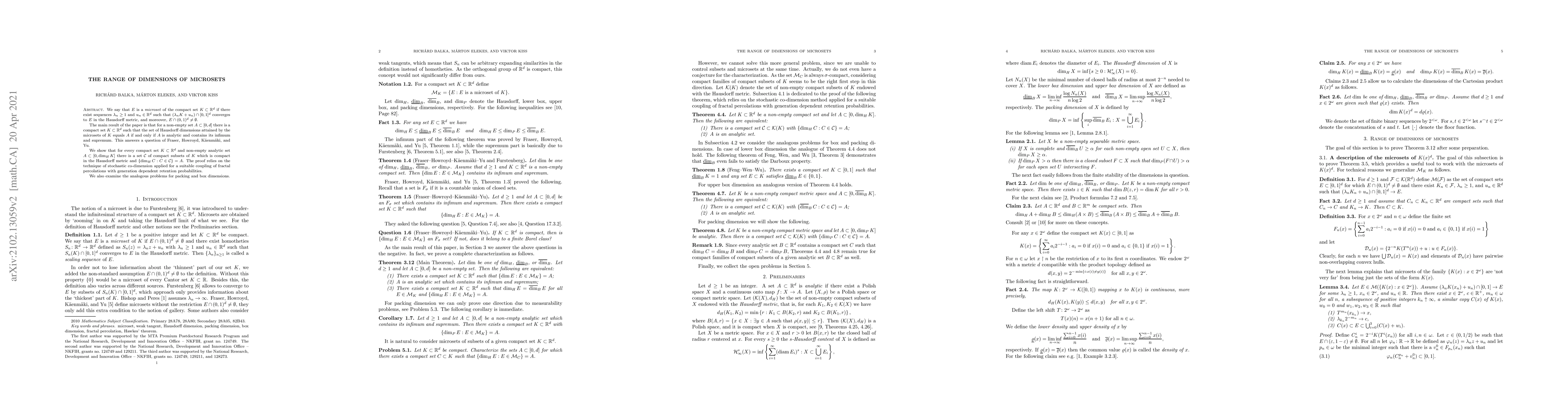 We say that $E$ is a microset of the compact set $K\subset \mathbb{R}^d$ if there exist sequences $\lambda_n\geq 1$ and $u_n\in \mathbb{R}^d$ such that $(\lambda_n K + u_n ) \cap [0,1]^d$ converges to $E$ in the Hausdorff metric, and moreover, $E \cap (0, 1)^d \neq \emptyset$. The main result of the paper is that for a non-empty set $A\subset [0,d]$ there is a compact set $K\subset \mathbb{R}^d$ such that the set of Hausdorff dimensions attained by the microsets of $K$ equals $A$ if and only if $A$ is analytic and contains its infimum and supremum. This answers a question of Fraser, Howroyd, K\"aenm\"aki, and Yu. We show that for every compact set $K\subset \mathbb{R}^d$ and non-empty analytic set $A\subset [0,\dim_H K]$ there is a set $\mathcal{C}$ of compact subsets of $K$ which is compact in the Hausdorff metric and $\{\dim_H C: C\in \mathcal{C} \}=A$. The proof relies on the technique of stochastic co-dimension applied for a suitable coupling of fractal percolations with generation dependent retention probabilities. We also examine the analogous problems for packing and box dimensions.