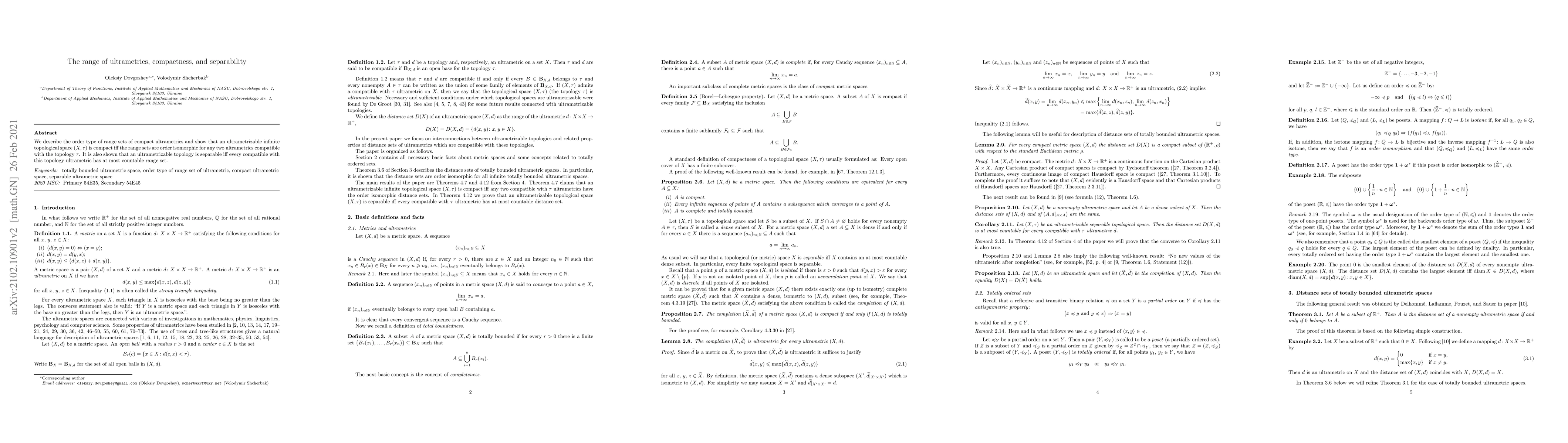 This paper explores the properties of ultrametrics in compact and separable topological spaces, proving that an ultrametrizable space is compact if its range sets of compatible ultrametrics are order isomorphic, and it is separable if every compatible ultrametric has a countable range set.