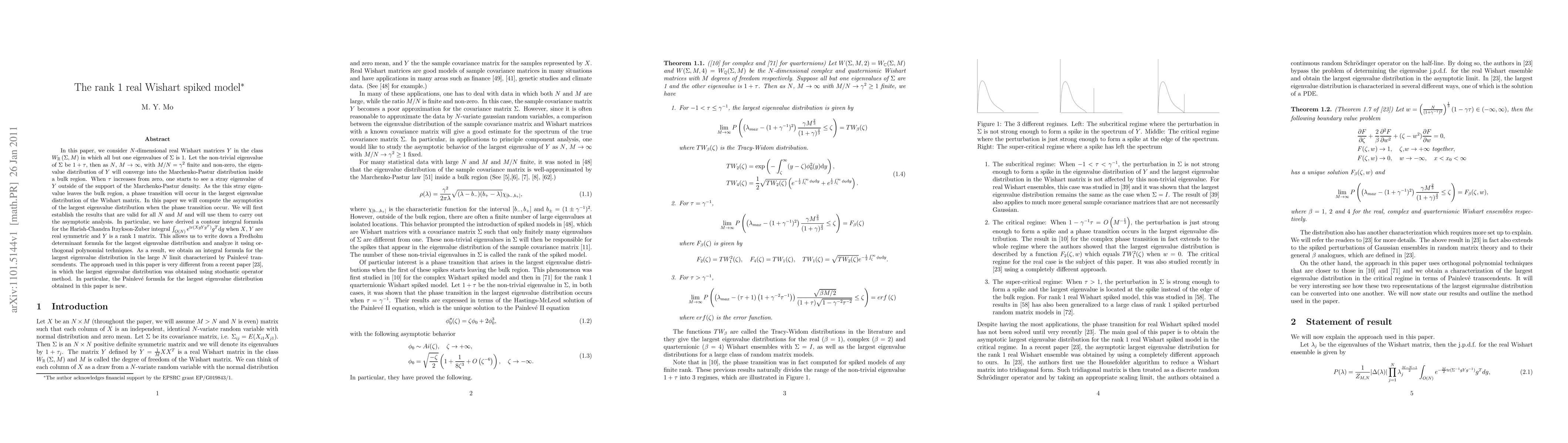 In this paper, we consider N-dimensional real Wishart matrices Y in the class $W_{\mathbb{R}}(\Sigma,M)$ in which all but one eigenvalues of $\Sigma$ is 1. Let the non-trivial eigenvalue of $\Sigma$ be $1+\tau$, then as N, $M\rightarrow\infty$, with $M/N=\gamma^2$ finite and non-zero, the eigenvalue distribution of $Y$ will converge into the Marchenko-Pastur distribution inside a bulk region. When $\tau$ increases from zero, one starts to see a stray eigenvalue of Y outside of the support of the Marchenko-Pastur density. As the this stray eigenvalue leaves the bulk region, a phase transition will occur in the largest eigenvalue distribution of the Wishart matrix. In this paper we will compute the asymptotics of the largest eigenvalue distribution when the phase transition occur. We will first establish the results that are valid for all N and M and will use them to carry out the asymptotic analysis. In particular, we have derived a contour integral formula for the Harish-Chandra Itzykson-Zuber integral $\int_{O(N)}e^{-\tr(XgYg^T)}g^T\D g$ when X, Y are real symmetric and Y is a rank 1 matrix. This allows us to write down a Fredholm determinant formula for the largest eigenvalue distribution and analyze it using orthogonal polynomial techniques. As a result, we obtain an integral formula for the largest eigenvalue distribution in the large N limit characterized by Painleve transcendents. The approach used in this paper is very different from a recent paper (Bloemendal and Virag ArXiv:1011.1877), in which the largest eigenvalue distribution was obtained using stochastic operator method. In particular, the Painleve formula for the largest eigenvalue distribution obtained in this paper is new.