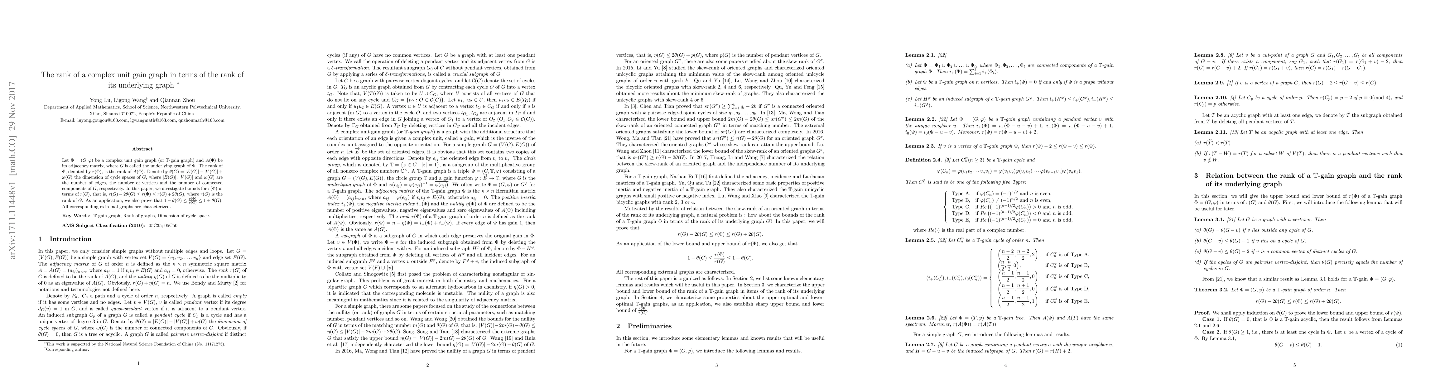 This paper explores the relationship between the rank of a complex unit gain graph $\Phi$ and its underlying graph $G$, establishing bounds for the rank of $\Phi$ in terms of the rank of $G$ and the dimension of cycle spaces of $G$. It proves $r(\Phi)$ lies between $r(G)-2\theta(G)$ and $r(G)+2\theta(G)$, and characterizes extremal graphs.