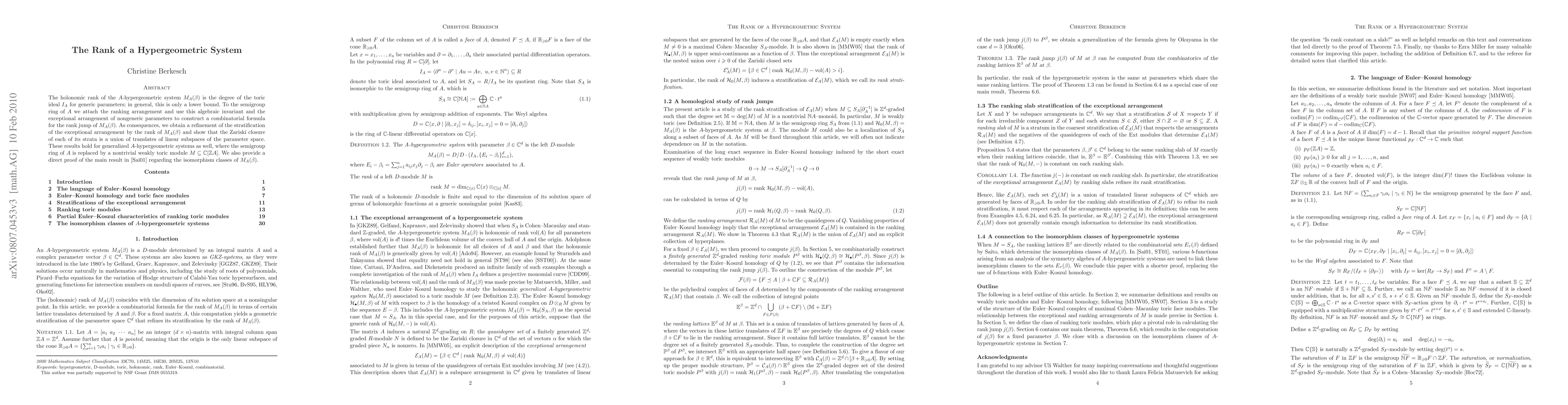 The paper investigates the rank of hypergeometric systems, providing a combinatorial formula for the rank jump of A-hypergeometric systems and showing that the Zariski closure of each stratum is a union of linear subspaces.